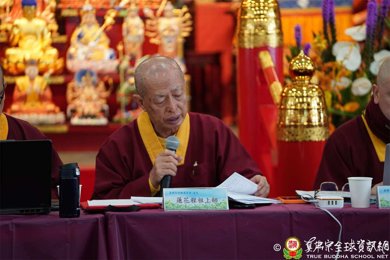 以宗歌為序幕、祈請根本上師加持持咒後,便由長老帶領誦戒。接著宗委會會長蓮花程祖上師致詞,回顧了2023下半年宗委會在馬來西亞、印尼、新加坡等地舉辦各項研習、供僧、交流活動,及2024年預備進行的活動等,以及覆准前期議案通過後,接著請傳法部諸位長老報告。