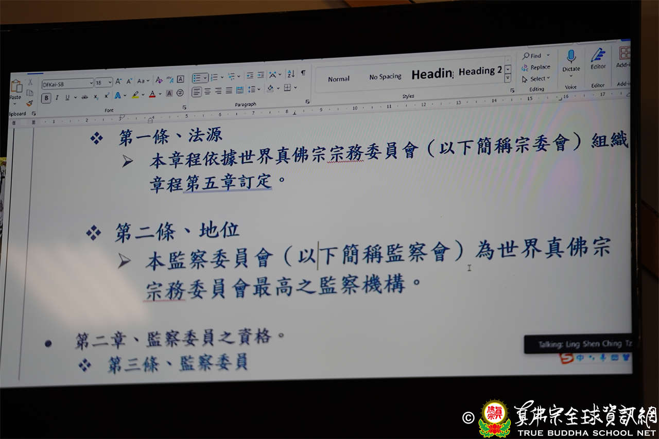 監察長蓮栽長老報告:真佛宗弟子遍及全世界,順應世間潮流,為確立三權分立,互相制衡之組織管理,分為行政(宗委會)、傳法部(長老團)、監察會(司法)三大結構,監察會著手擬定「監察會組織章程」草案,選出4~6位監察委員,監察委員不得兼任常務委員,作為覆核、糾正核心小組等,相關草案正修訂中。