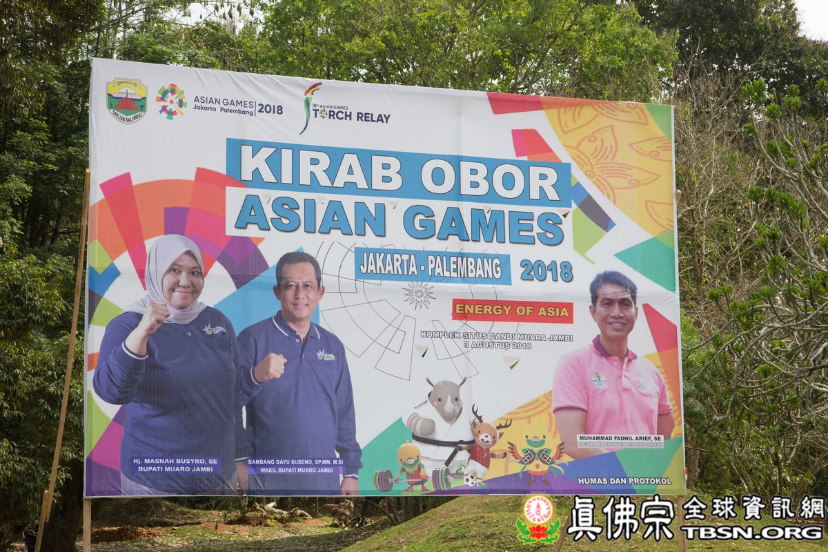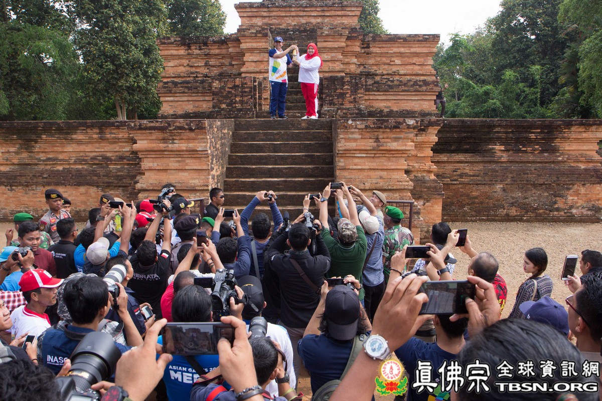 上午九時,迎賓舞及傳統音樂揭開了序幕,亞運主辦單位抵達會場,在占碑古蹟入口牌坊處,將象徵聖火的燈炬,交棒給占碑副縣長 Bambang Bayu Suseno, SP. MM. M. Si,副縣長代表接受後,前行至古蹟區內最大的聖塔,再由縣長Hj. Masnah Busyro, SE正式接下聖火,並與當地政要合影,且致詞祝福此次2018年亞運在印尼能成功圓滿的舉辦。接著,更接受來自世界各地約40個媒體的聯訪,此次亞運是印尼自1962年後,睽違超過半世紀後再次舉辦的盛會。