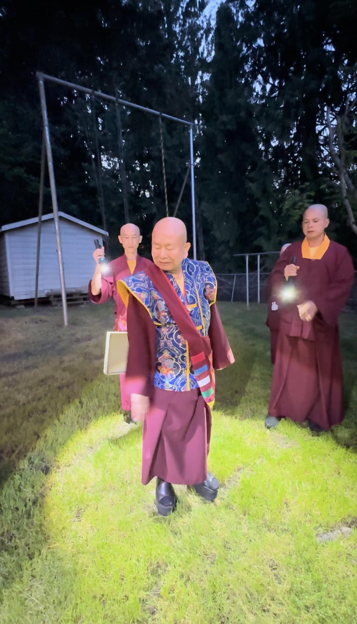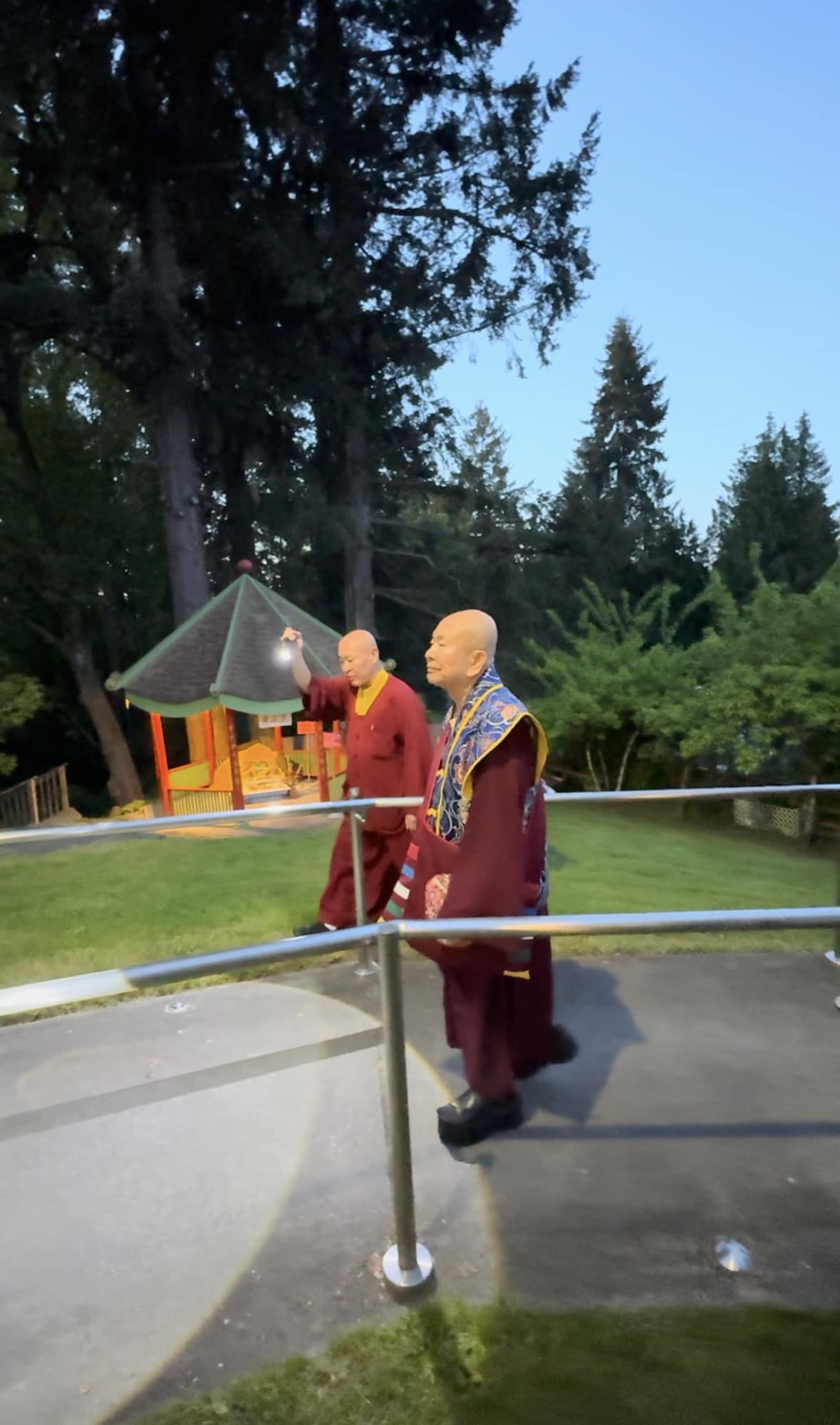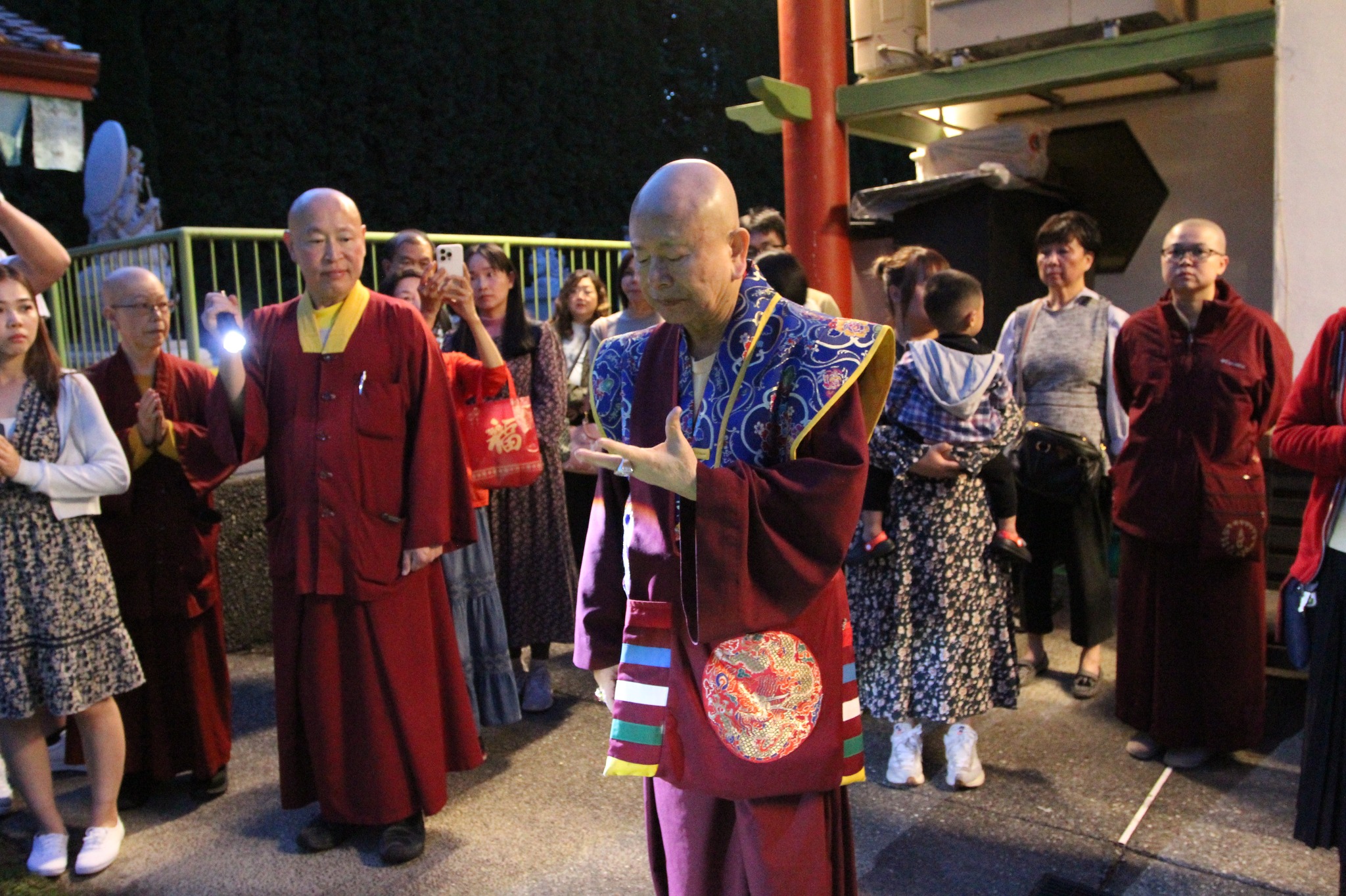 堪輿結束後,師尊回到真佛密苑,在門口與大家談話時,突然問起月亮在哪裡?眾人紛紛仰望夜空找尋,只見明亮的下弦月正好掛在剛剛師尊所點的月下老人祠處的上空,眾人驚訝不已,直呼相應了!師尊說,真的是月下老人耶!將來想求婚姻的都可以來求月下老人,得到紅線有個好姻緣。