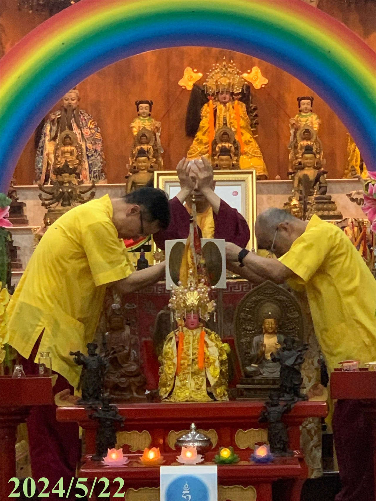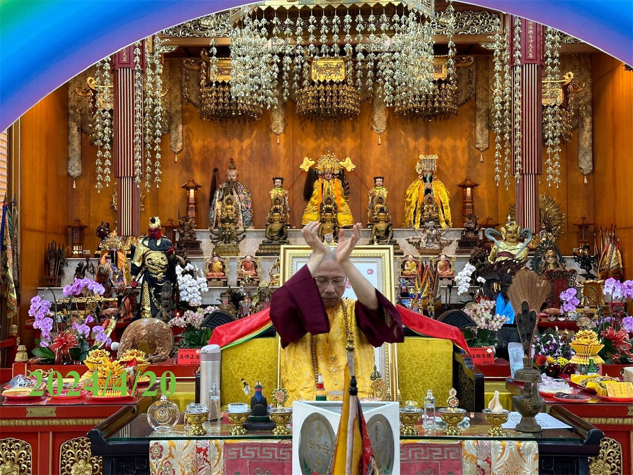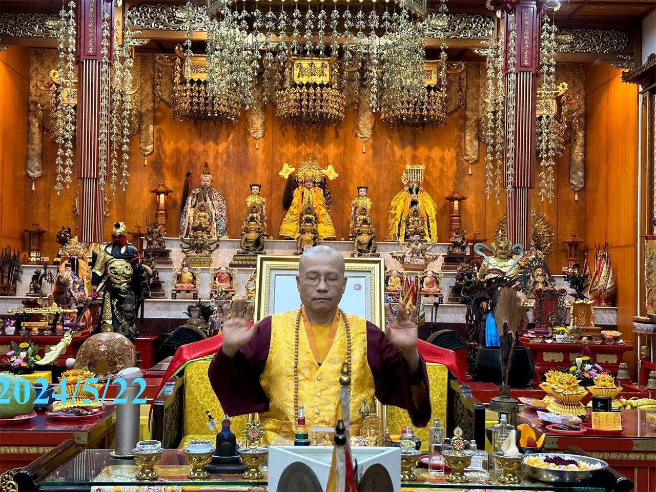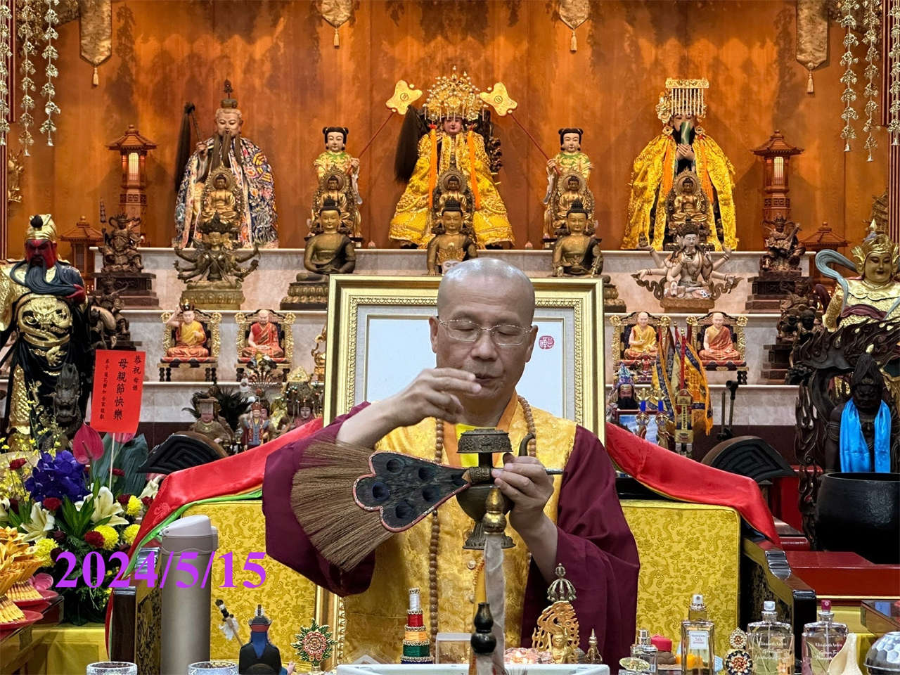 釋蓮郲上師於2024年4月17日、4月20日、5月8日、5月11日、5月15日、5月18日、5月22日在台灣金極雷藏寺主壇專壇「請佛住世瑤池金母水供」,迴向師佛: