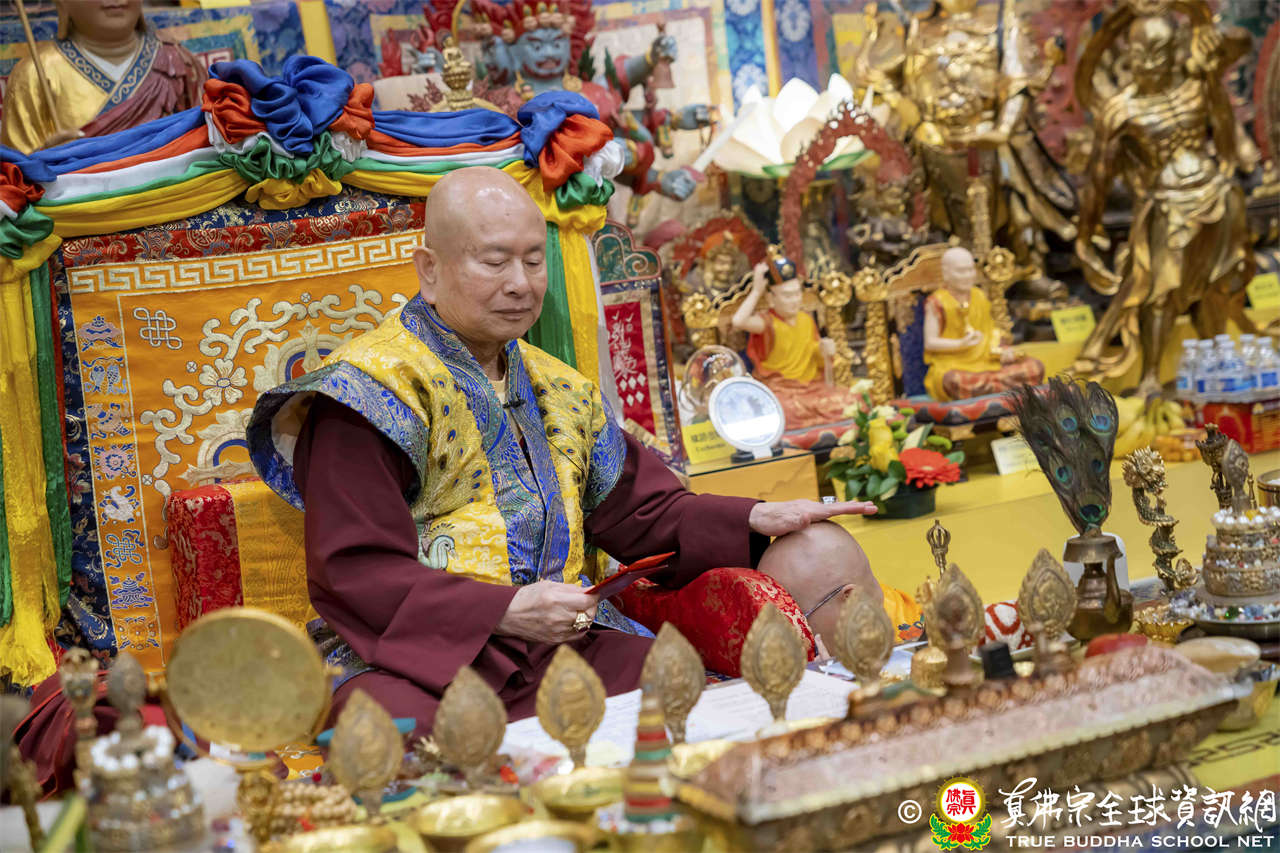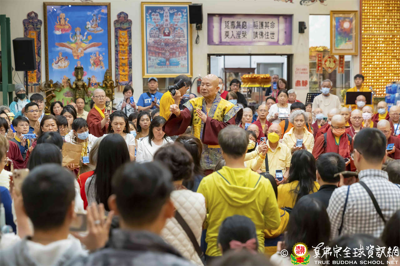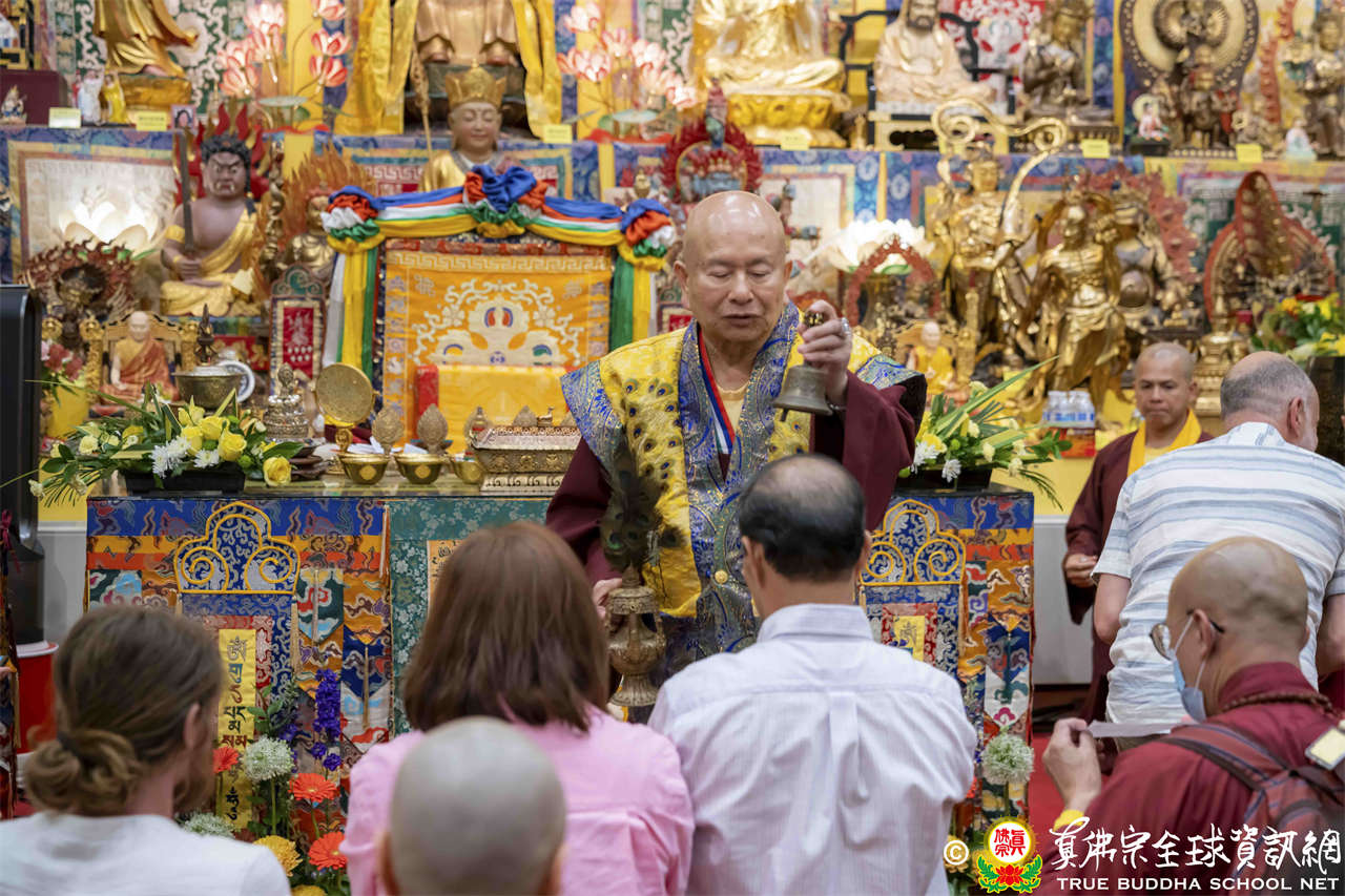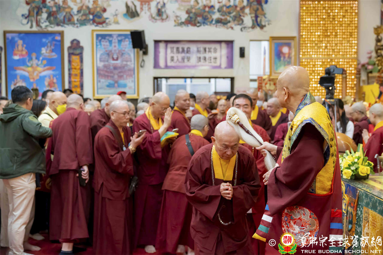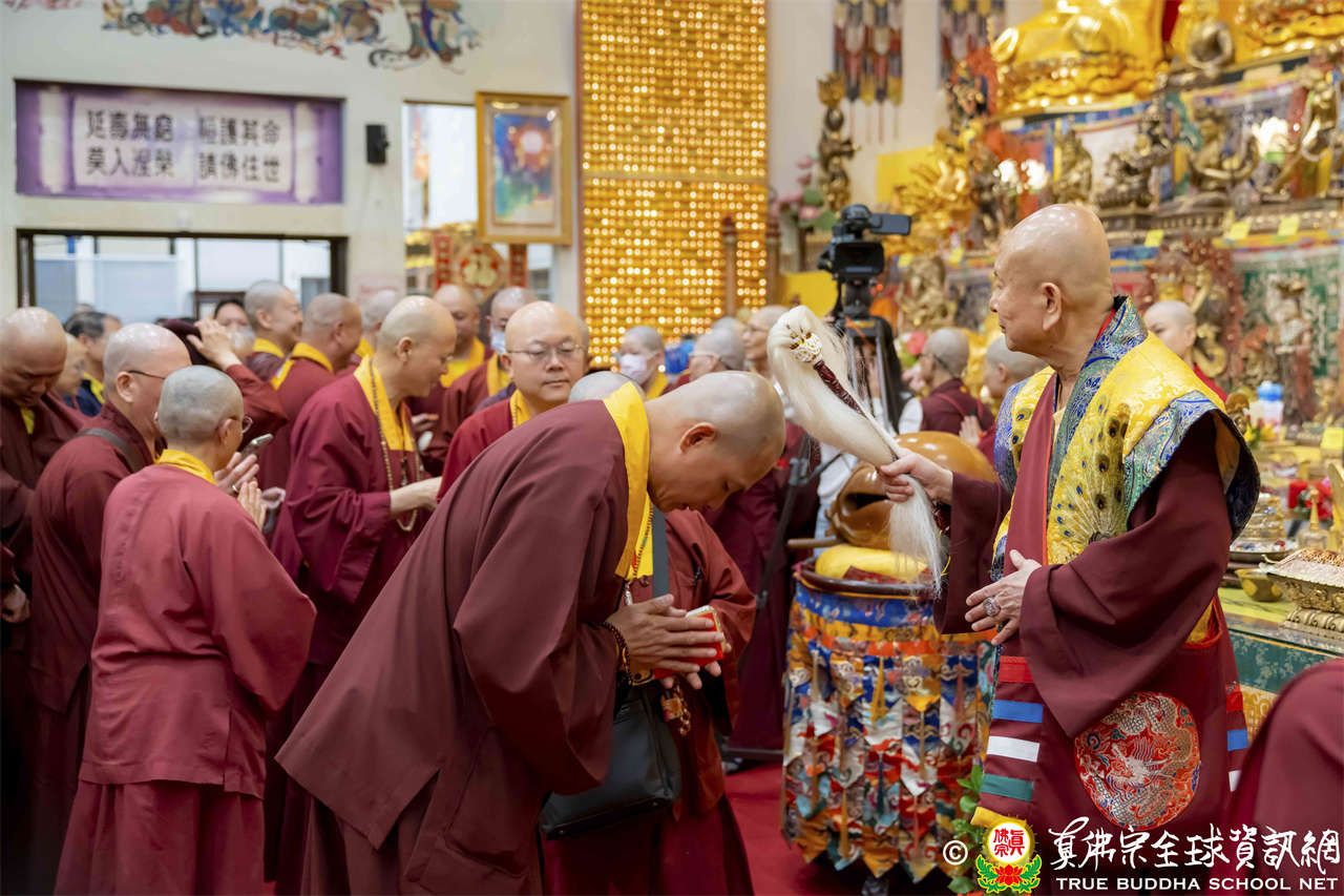 聖尊在寶貴精妙的法語開示結束後,為求皈依者賜授皈依灌頂、加持大悲咒水,及開光佛像,最後以拂塵摩頂加持大眾。