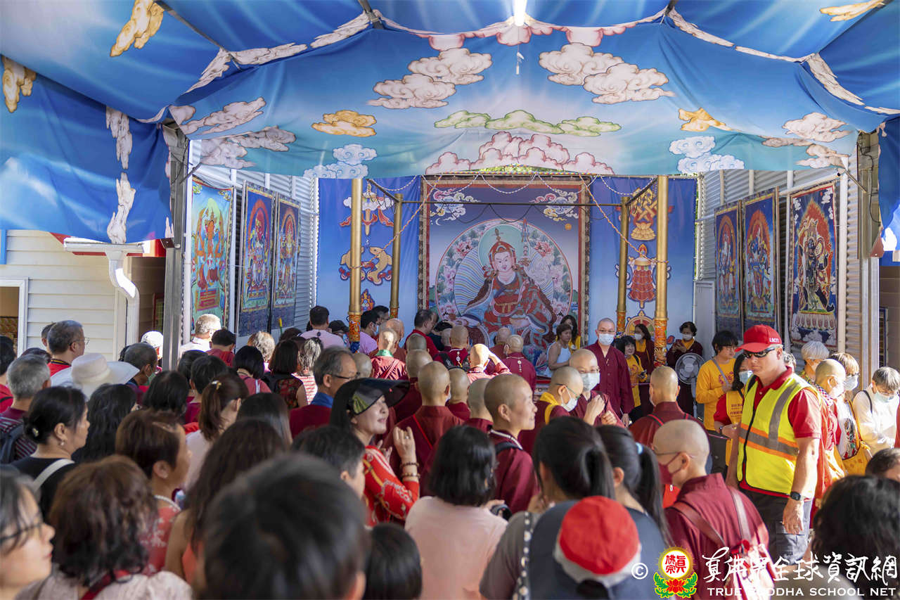 接著法王介紹法會主尊「蓮華生大士」。法王說,「蓮師是藏密的祖師,藏人稱其為咕嚕仁波切,在達拉郭嘯海的蓮花中誕生,所以密號為海生金剛。蓮師的一生充滿傳奇,在世的時間也長,在藏地弘法50年。」