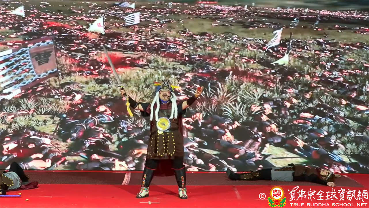 蓮琪上師的聲音宏亮,不需要配戴麥克風也能讓全場聽見成吉思汗倒下前的忿忿心聲:「我,成吉思汗,百戰百勝,竟然攻不進小小的西夏國。」最後憤恨吐血而亡。