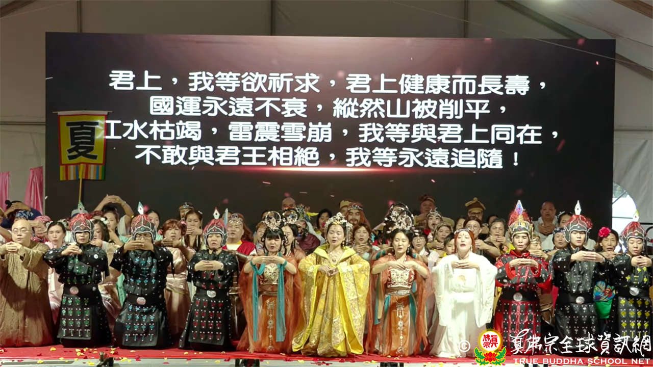 最後一幕是所有演員上台共同發願:「君上,我等欲祈求,君上健康而長壽,國運永遠不衰,縱然山被削平,江水枯竭,雷震雪崩,我等與君上同在,不敢與君王相絕,我等永遠追隨!」相信這一幕大家不會忘記,尤其是「我等與君上同在,不敢與君王相絕」,也許大家都曾經有這樣的誓願,才得以在輪迴流轉中,再度找到師父。據悉這一幕在彩排的時候,便有演員感動到不禁落淚,彷彿自己置身當年與師父同在。