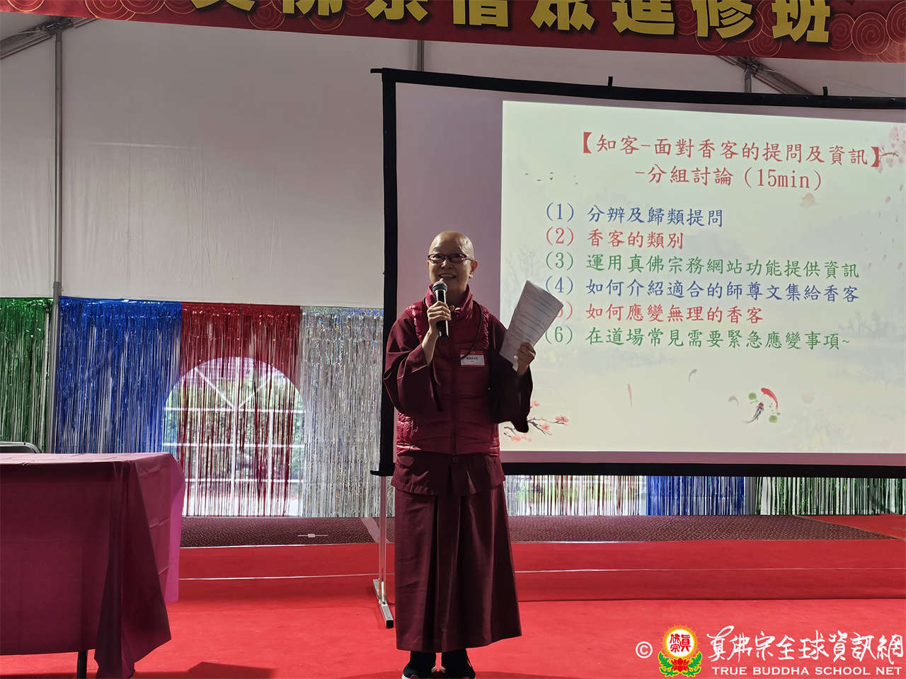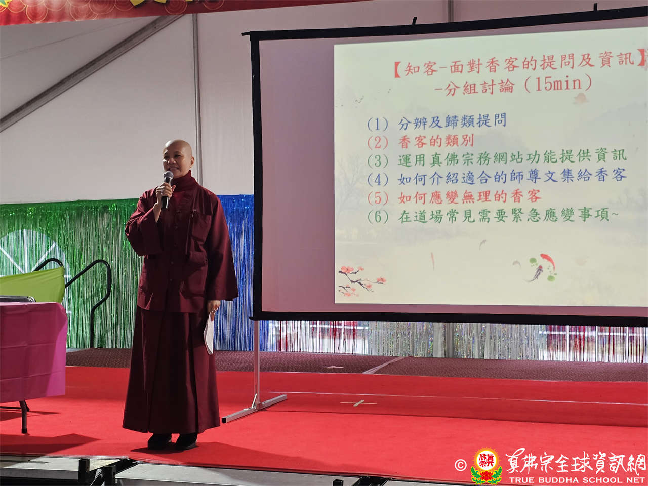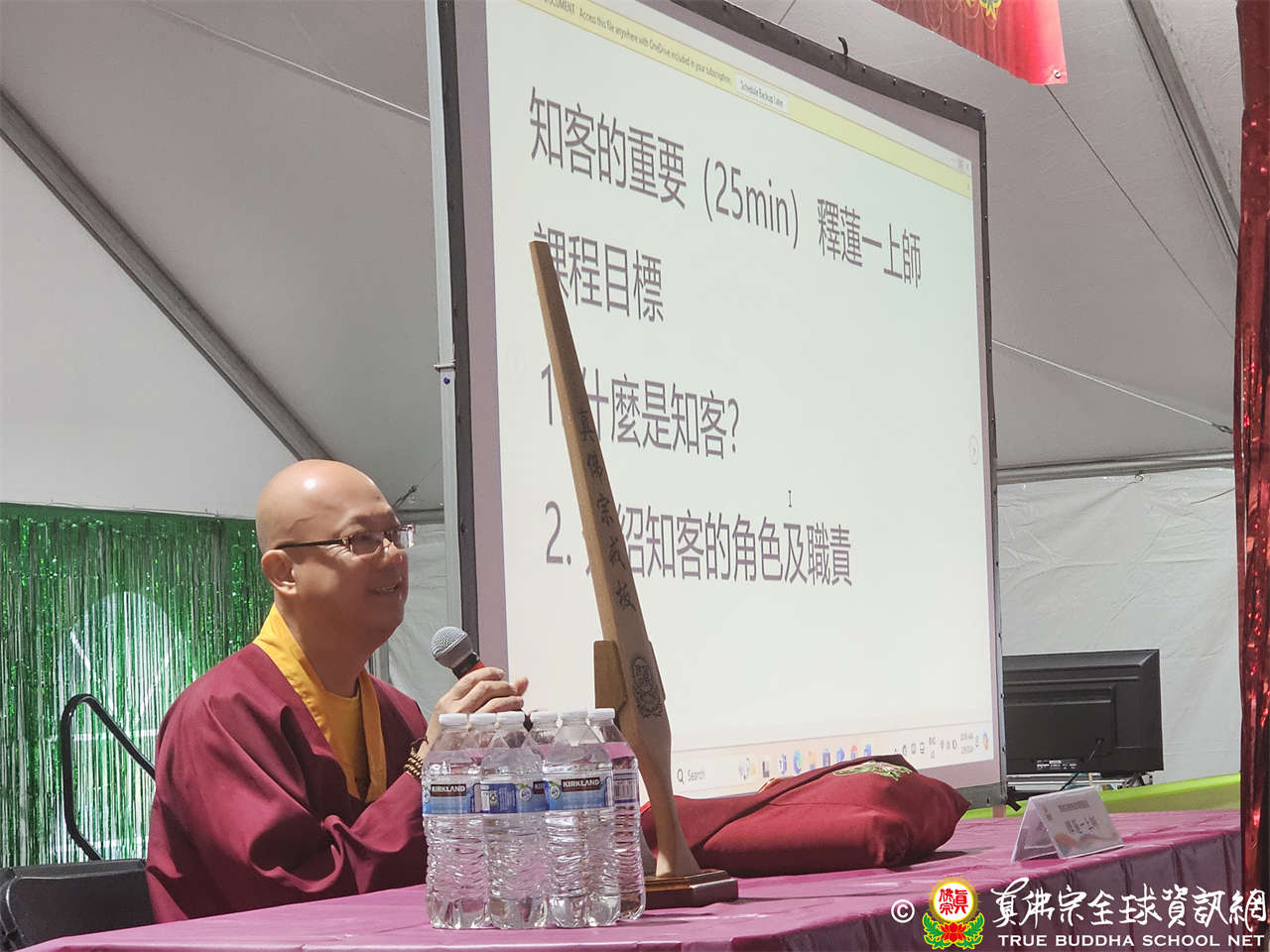 第一堂課登場的是「知客的重要」,由蓮一上師主講。「知客」於字面上的解釋為「知曉客人」,可謂各道場第一線接觸來訪者的人,亦是道場與外界之間的重要聯繫人,角色非常重要。往往來訪者的第一印象也取決於知客的態度,所以推動法務興旺,道場務必要重視知客的培訓計畫。