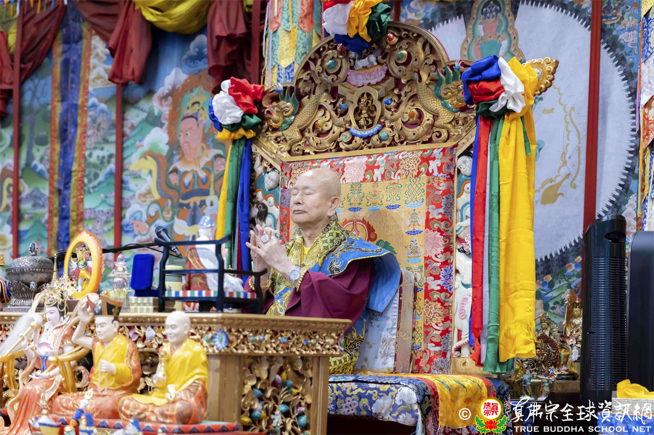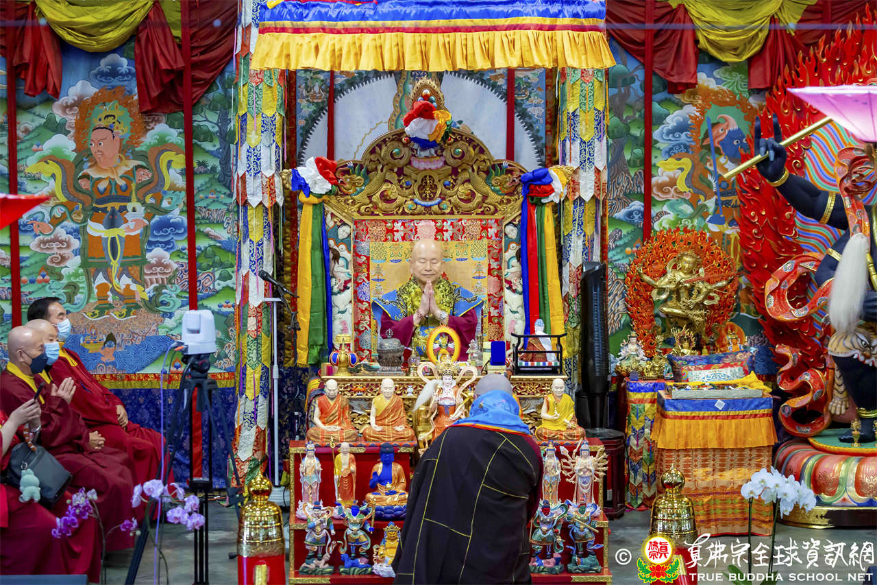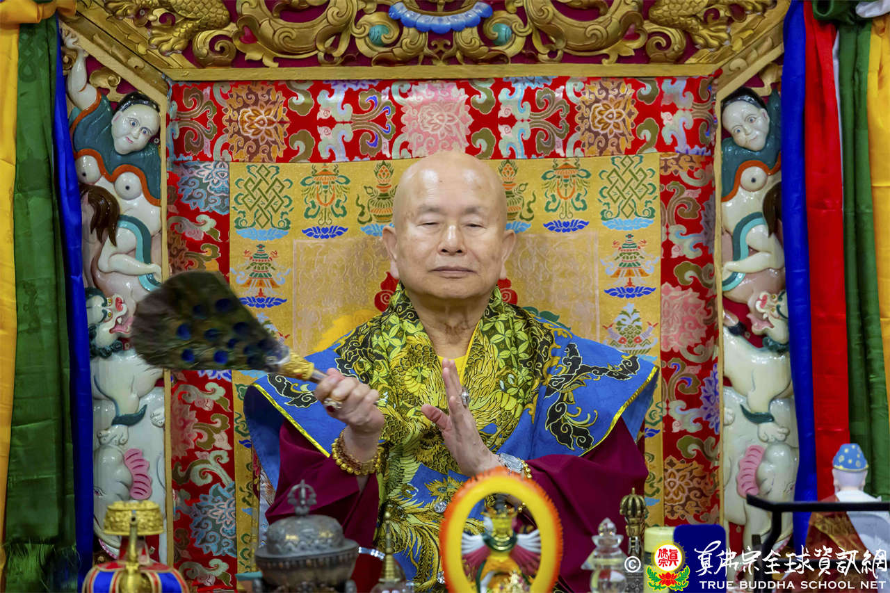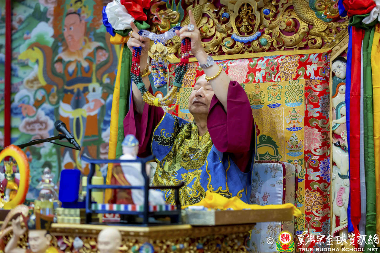 接著法王介紹法會主尊時輪金剛說道,「這是密教難得殊勝的大法,祖師也囑咐要將之廣傳世界五大洲。按照祖師所傳,主持時輪金剛法,必須十個指頭都必須帶上戒指。」