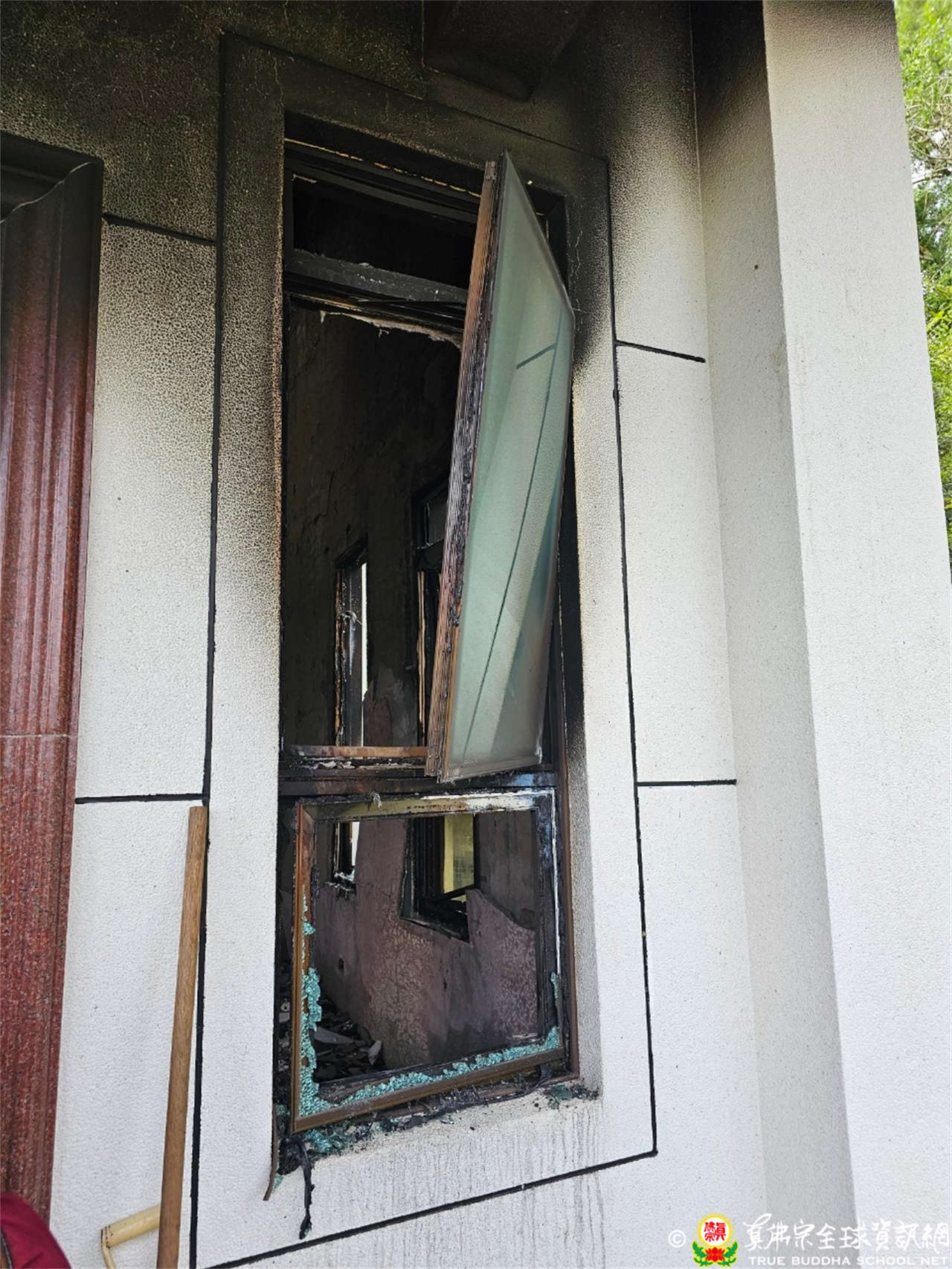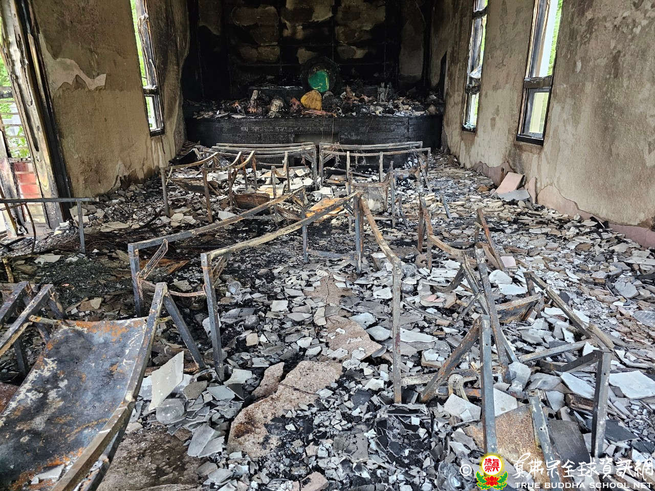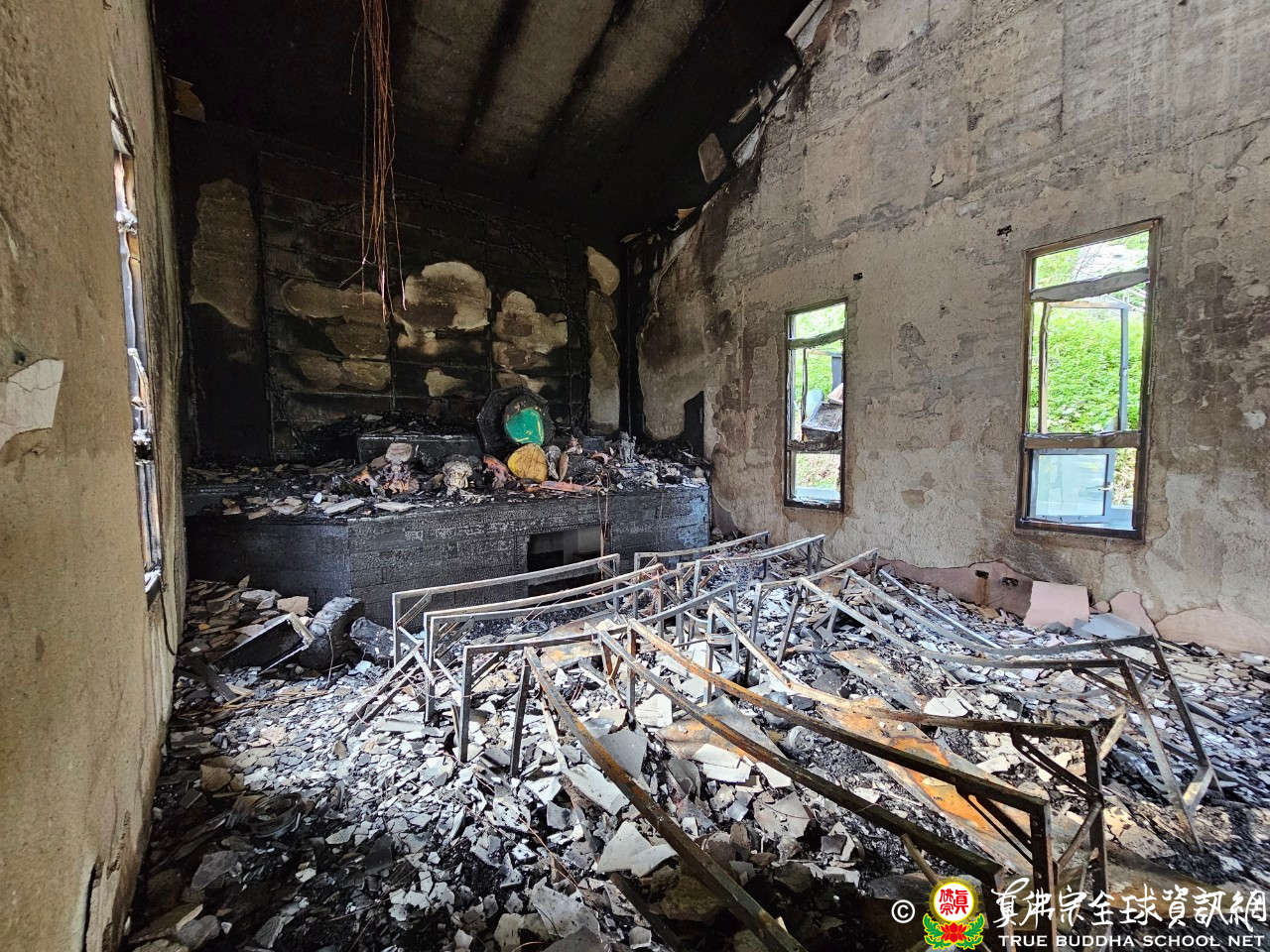 這次的探訪中,親臨火災發生點「觀音殿」,殿內全數燒毀,包含密壇的三十二尊佛像,門窗也因為高溫而變形,地板全是瓦礫碎片,令人觸目驚心。所幸當初天花板使用防火建材,僅是觀音殿內部受災,外牆則是被煙燻黑了,其他各殿無恙,沒有人員傷亡。