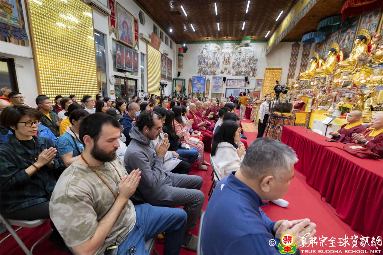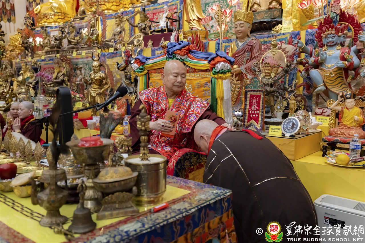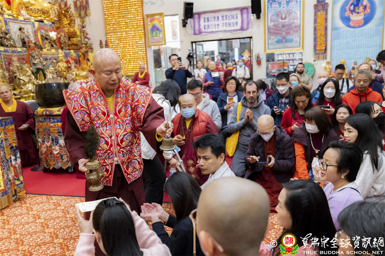 在寶貴的法語開示之後,聖尊為新皈依者進行皈依灌頂,加持佛像、供品以及大悲咒水,最後以拂塵加持與會大眾。聖尊滿懷慈悲,為了讓普羅大眾皆能領會深奧佛法,以最樸實無華的話語開演最高深的智慧,諄諄教導,與會眾人法喜充滿。