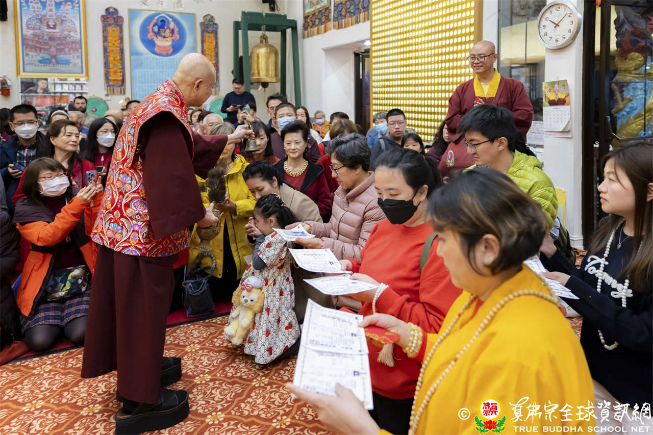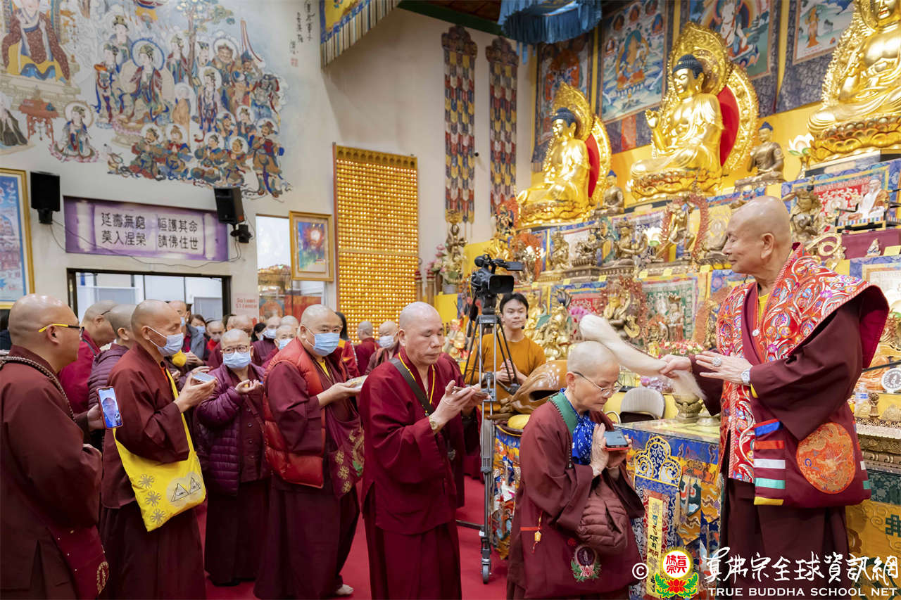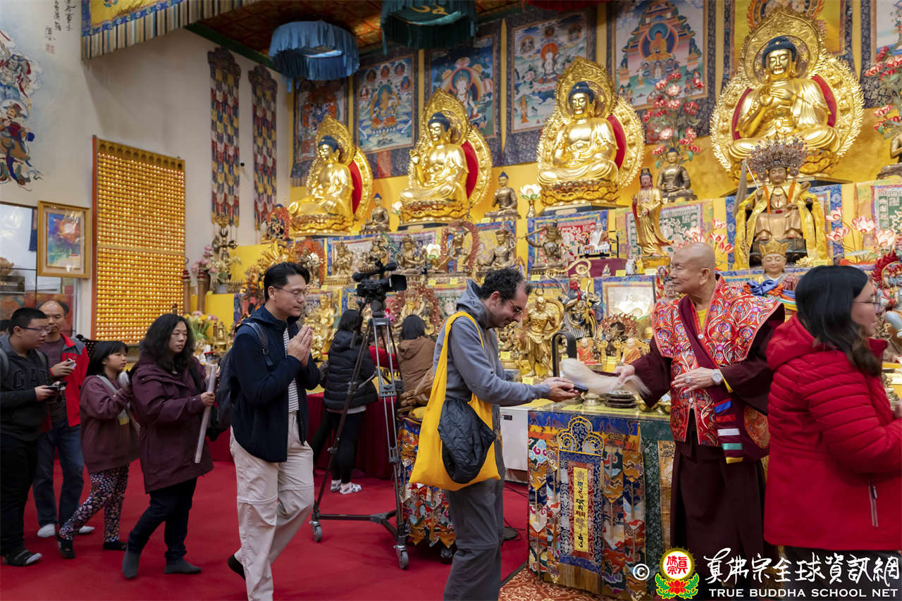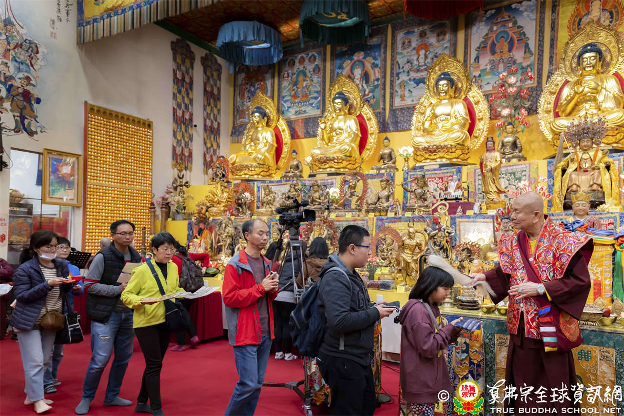 在寶貴的法語開示之後,聖尊為新皈依者進行皈依灌頂,加持佛像、供品以及大悲咒水,最後以拂塵加持與會大眾。聖尊滿懷慈悲,為了讓普羅大眾皆能領會深奧佛法,以最樸實無華的話語開演最高深的智慧,諄諄教導,與會眾人法喜充滿。