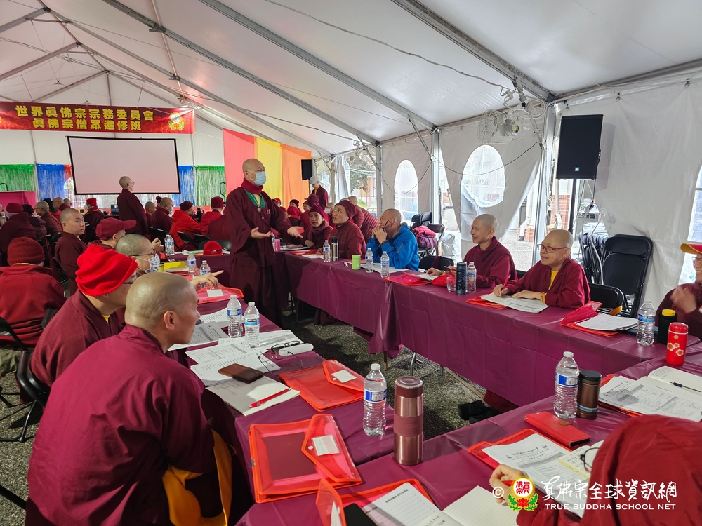 經過蓮僧長老解說後,接下來便是進行分組討論,如何推動「真佛互助祈禱會」?首先蓮竹教授師請法師們回想,曾否同門有煩心的事情,來到佛堂尋求解決之道呢?當時法師又是怎樣為他做開解呢?有了這個切入點,大家便開始交頭接耳思考記憶中曾有的例子。最後回歸到正題,各組代表開始發言。