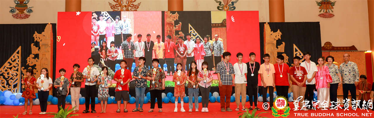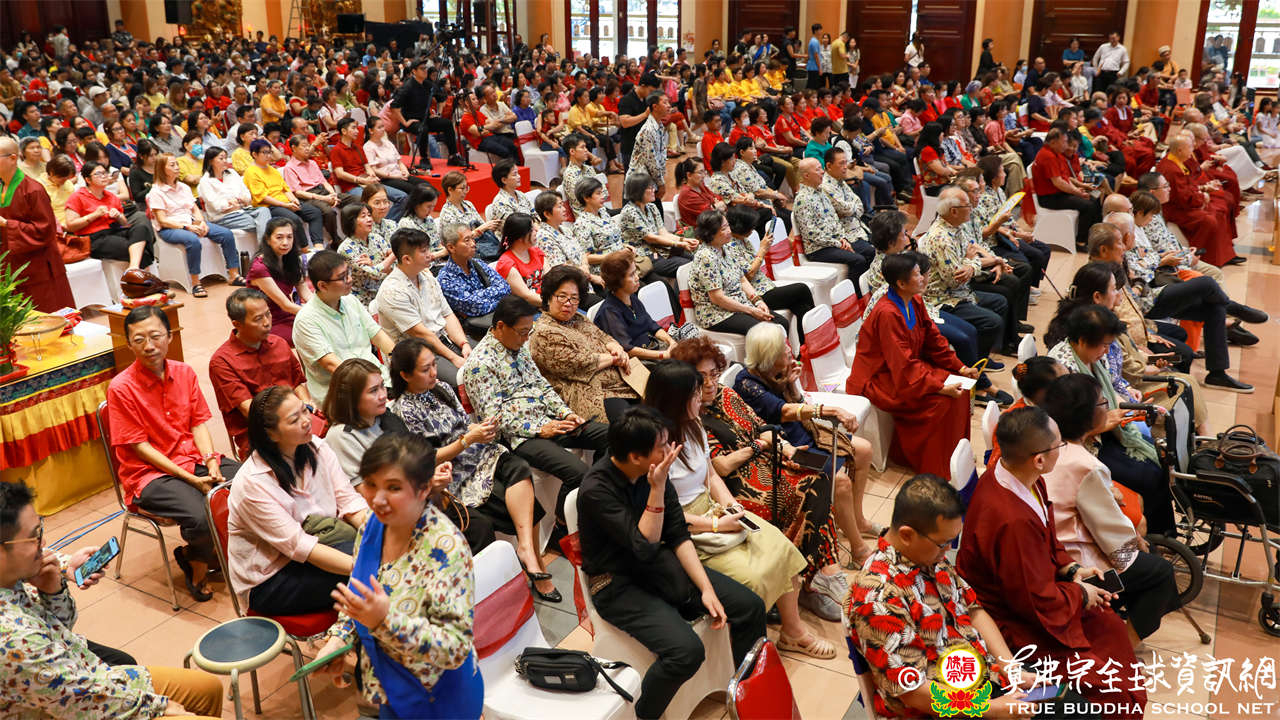 今日蒞臨的上師除了蓮飛上師,還有大覺堂的蓮樣,蓮妗上師,及馬來西亞的蓮一上師。下午三點多,整個大殿已經座無虛席。節目開始,首先大眾起立唱國歌。然後是敬德學校的小學生表演昂格浪樂曲,印尼雷藏寺佛學班學生唱“感恩真佛”宗歌,大屏幕上放出師佛蒞臨為印尼雷藏寺開光安座的照片,以及一些前輩們的照片,令人勾起無限回憶。
