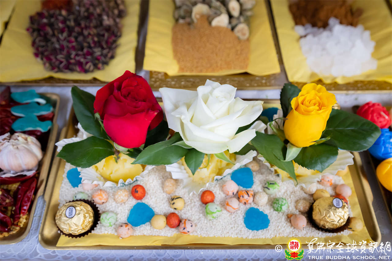 接著法王介紹法會主尊除蓋障菩薩說道,「除蓋障菩薩是八大菩薩其中的一尊,祂可以除掉最深的業障。我們因為有這個業障,才會煩惱跟障礙。藏在最深意識裡面的業障,除蓋障菩薩都能夠幫你清除掉,祂的金剛號是「無惱金剛」、「離惱金剛」,離開煩惱的金剛,是胎藏界曼荼羅除蓋障院的主尊。」