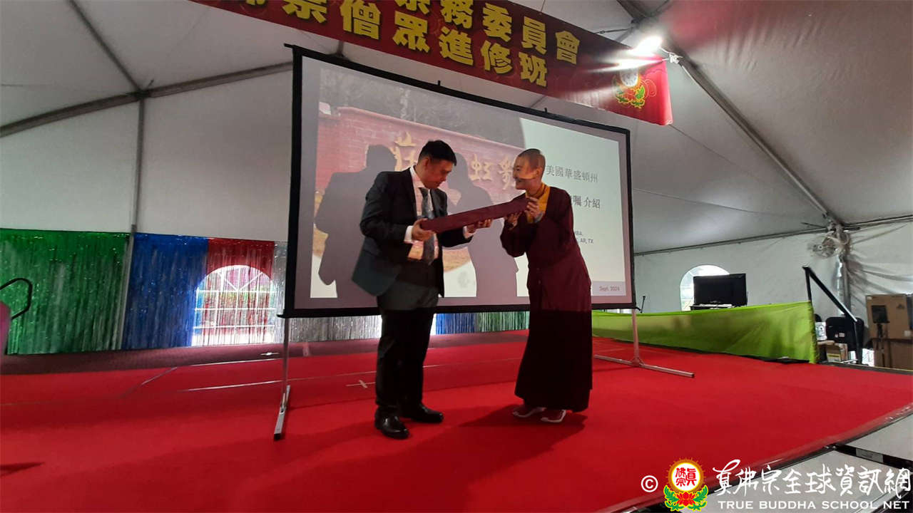 課程開始前,由公關處處長蓮伽上師代表宗委會致贈紀念禮物,感謝賴律師特別撥冗前來彩虹雷藏寺為僧眾授課。