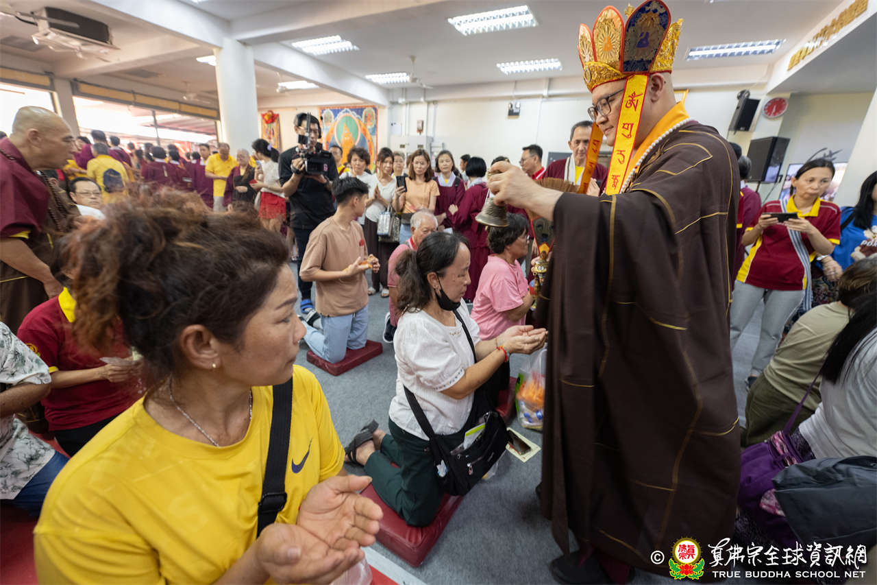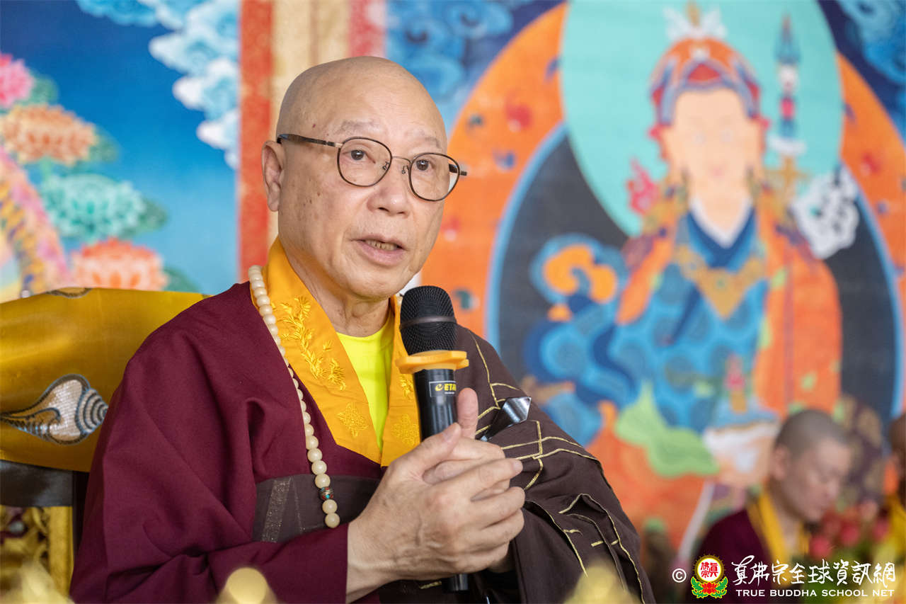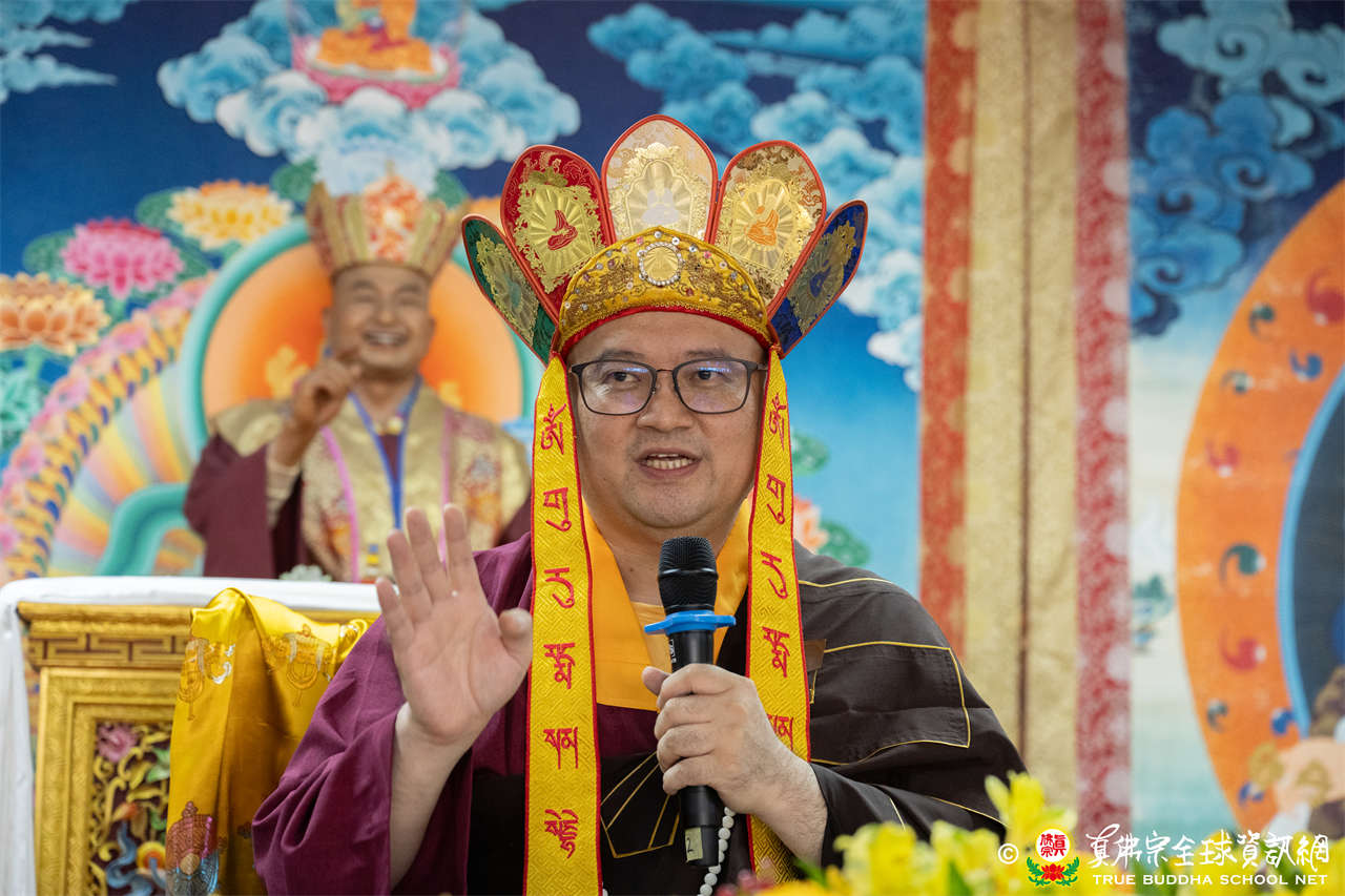 法會主壇上師蓮東上師開示時,首先感謝根本傳承上師慈悲特許其代師傳授「聖觀音第一富豪法」,及為與會大眾做賜福與傳法灌頂。上師相信由諸位長老及上師在「教育實體研習班」中所分享的佛學知識及修法口訣心要,必讓所有學員收獲滿滿。上師再恭賀所有獲得獎章的僧伽及居士弘法人員之際,也不忘感謝所有一直以來為宗派道場默默付出的弘法人員、同門及義工。上師指出:「此次為期一個星期的系列教育與法會活動,仰賴所有人的付出。有錢出錢、有力出力。無論是財布施、法佈施或無畏布施,都是在發菩提心,與聖觀音一樣慈悲喜捨、四無量心。」有了諸位同門及善信大德的發心付出,體現諸佛菩薩無緣大慈、同體大悲的精神,方有促使法會圓滿進行的因緣。義工團隊的發心付出與服務,體現了諸佛菩薩的慈悲精神。