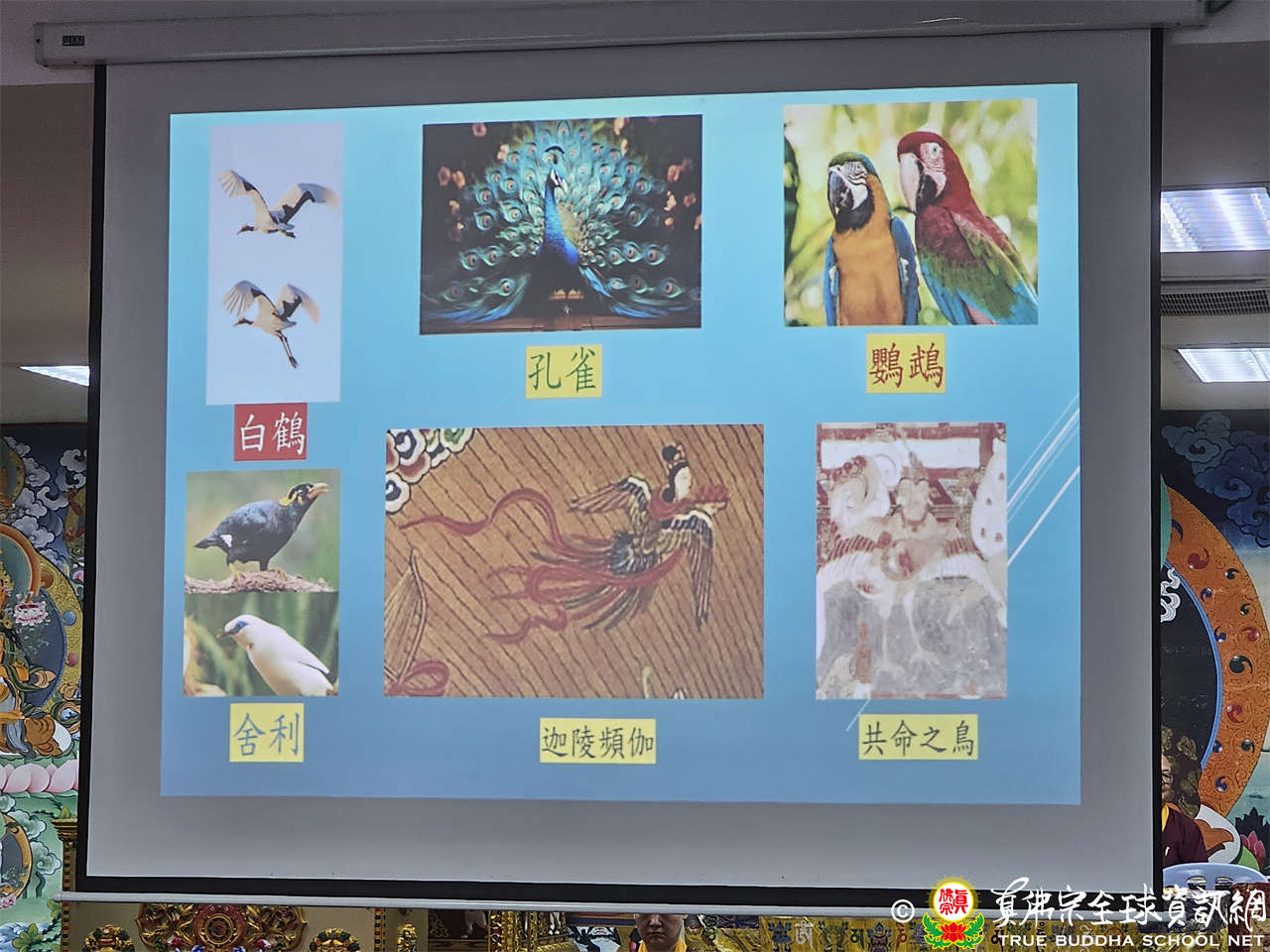 蓮者上師特地找了白鶴、孔雀、鸚鵡、舍利、迦陵頻伽、共命之鳥的照片,還有一段視頻是「舍利鳥」,舍利會模仿所聽到的各種聲音維妙維肖。