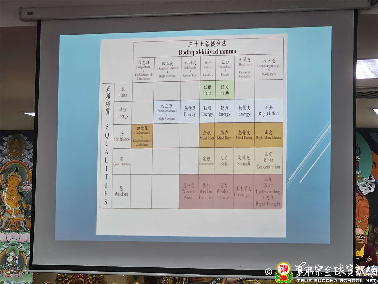 實體研習班接續第四天課程,在系列報導五有蓮滿長老、蓮傳長老講授風水知識,蓮萊上師以另一種方式講解「原來可以這樣死」,接著再來了解「三十七道品」,邀請宗委會財政處處長暨服務於紐約金剛雷藏寺的蓮者上師授課。