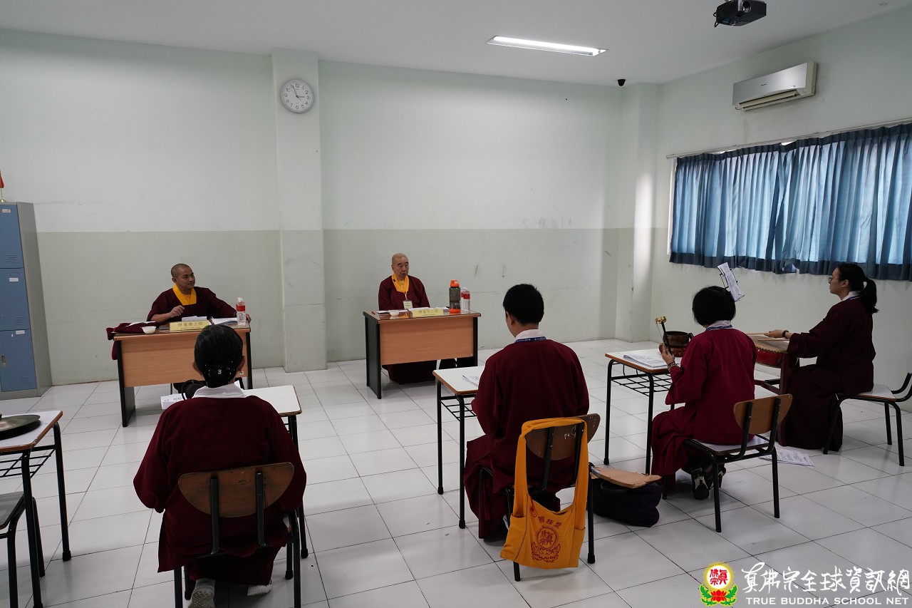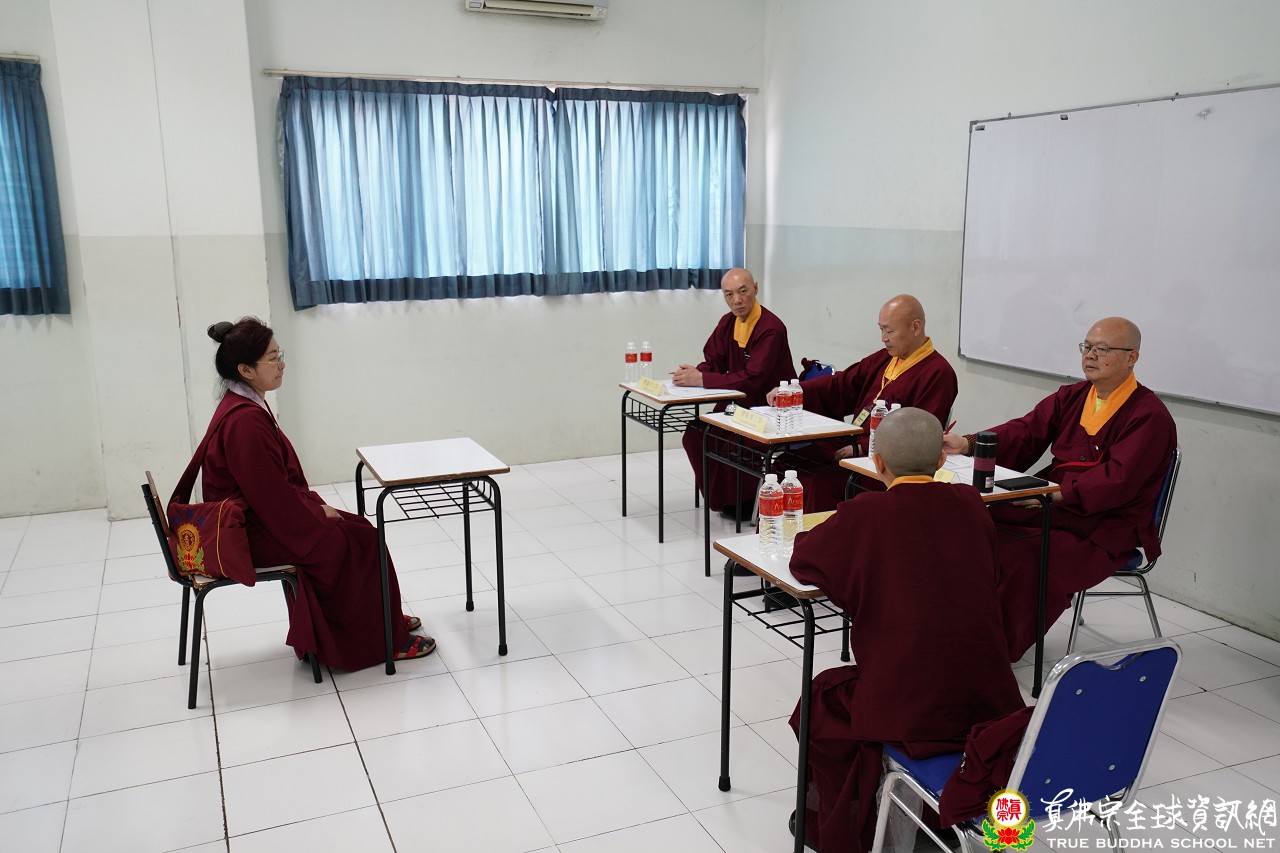 6月26日上午是筆試,講師助教在同一間考場作答,當然試卷不同。下午的面試及梵唄,則在敬德學校的教室舉行。一共借用了6間高中生的教室作為考場,其中一間是考生等待室,兩間作為梵唄考場,三間用來面試,每間考場有三位上師。考講師的先接受面試,考助教的五人一組先考梵唄。考試期間嚴禁交談,大家都能遵守規則。這場考試一直進行到下午五點才全部結束。晚餐後宗委會上師們和密總,總協,及印尼上師召開一次工作會議,直到晚上九點半過後,才回去休息。