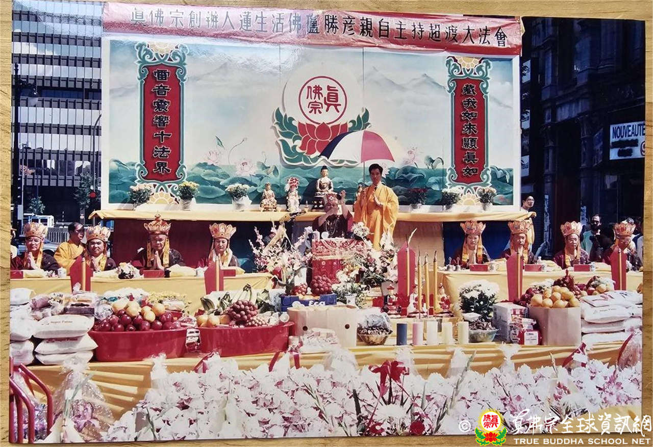 25日下午3點在根本上師在唐人街聖羅倫大道(Boul.St-Laurent)主持中陰身超度大法會,是日萬里晴空,達官顯要冠蓋雲集,來自各地的人潮大量湧入,萬人空巷大轟動,當場接受皈依灌頂多達七百餘人,當地政府特別為這場法會管制封街、派出交通警察維護秩序。當地最大法文報與華人各大報,皆於頭版報導本次法會大場面實況。真佛報第40期頭條新聞寫下「聖羅倫大道,史無前例,露天大法會,萬人空巷,舉城震撼。」