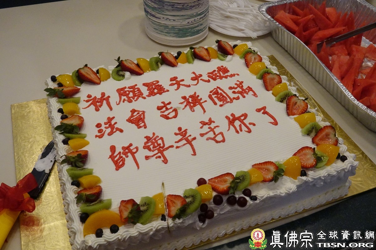 為了感恩師佛慈悲教導我們的離苦得樂的佛法,弟子們準備了精彩的節目供養。其中蓮琴法師深情地唱了由扣鐘偈改編的「南無真佛海會佛菩薩,南無彩虹山雙蓮界大白蓮花蓮生活佛…… 」一段偈。在他奉師命建設雙蓮境界靈骨塔的時候,遇到困難,考驗時,就向虛空唱這個偈,祈求師佛,佛菩薩諸尊加持,度過了種種難關,感恩之情融在淳厚的歌聲裡,感人肺腑,引起大家熱烈的掌聲。