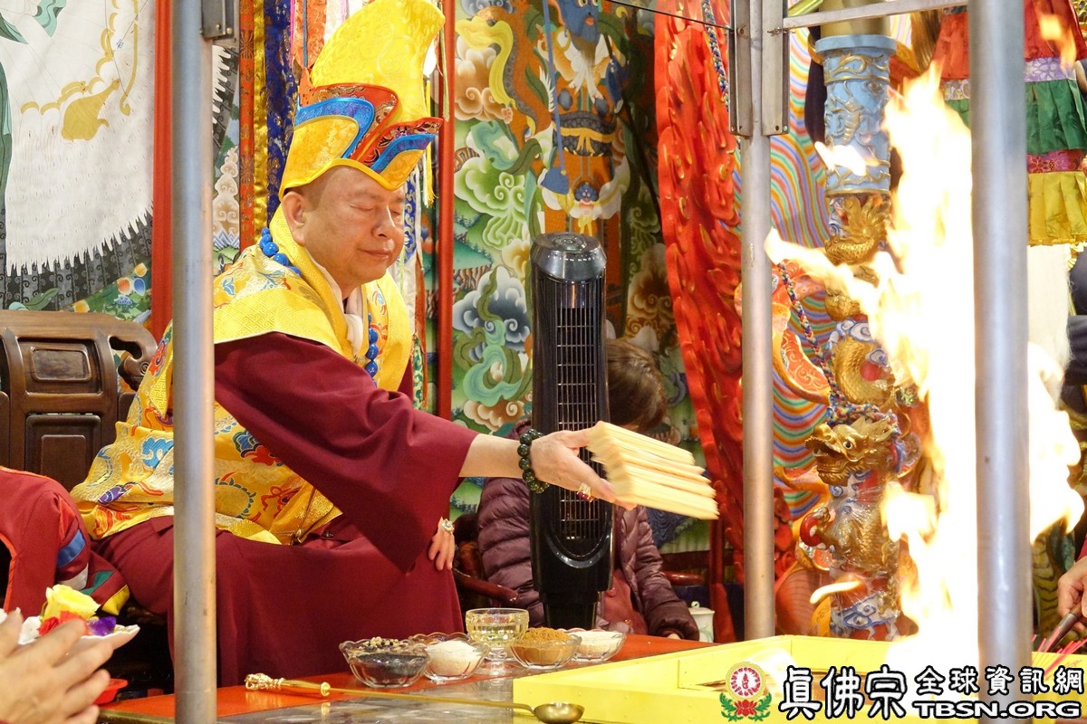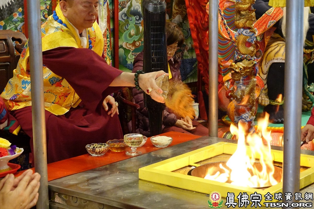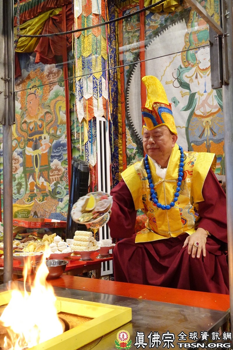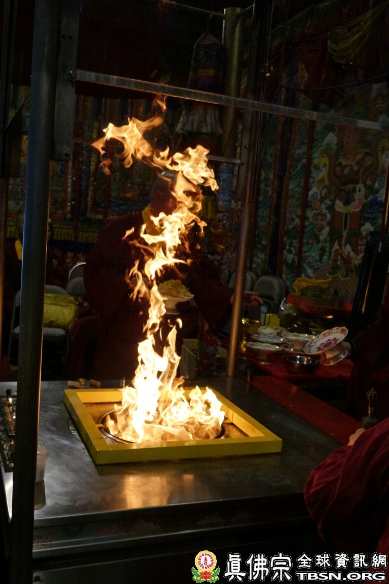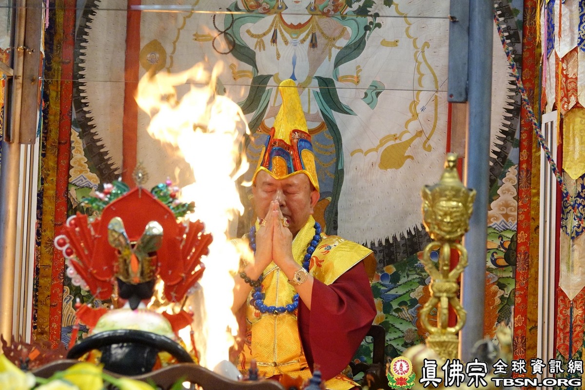 下午二點三十分,釋迦摩尼佛大法會正式拉開序幕,師尊點燃護摩火,頓時熊熊火焰沖天,咒音攝人心魄,與會大眾齊誦「釋迦摩尼佛心咒」,手結「釋迦摩尼佛手印」,覌想在烈焰中與釋迦摩尼佛、火天神合一,進入火光三昧。師尊在火光中演化息災、增益、敬愛、超度大手印,在陣陣法流的加持下,祈望能夠除一切的業障,煩惱。