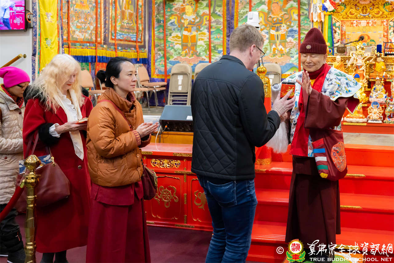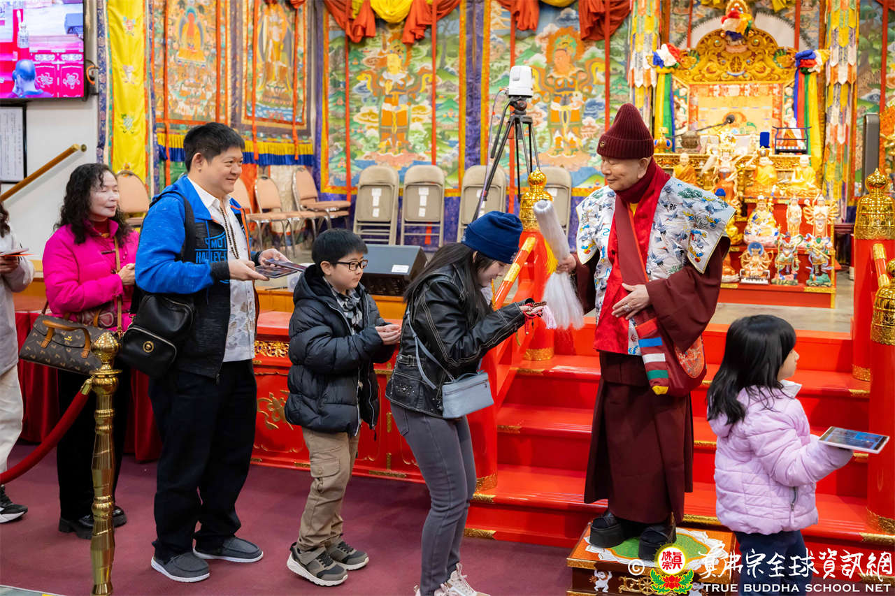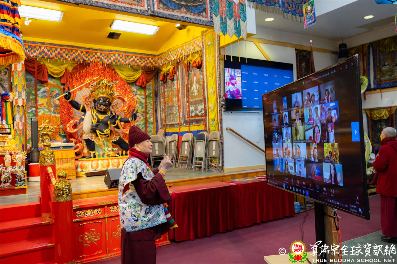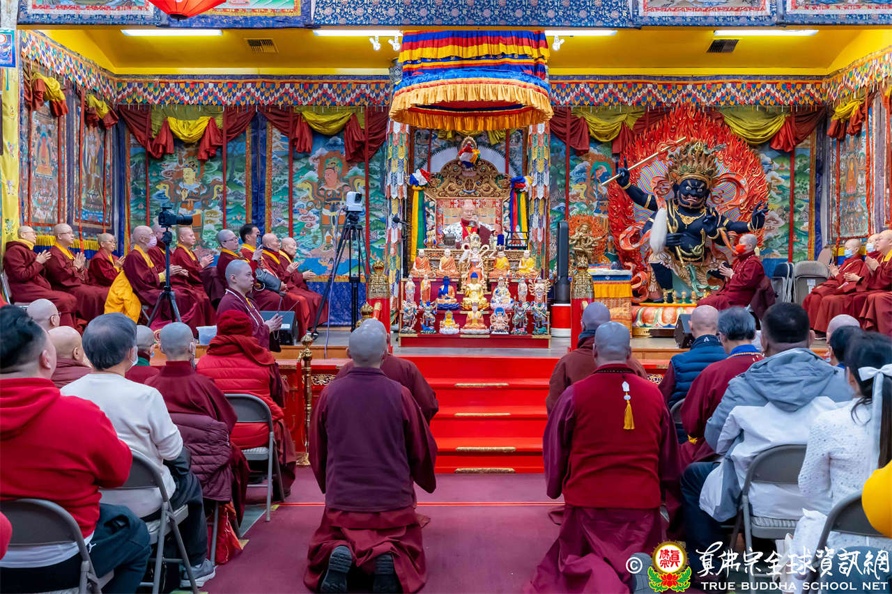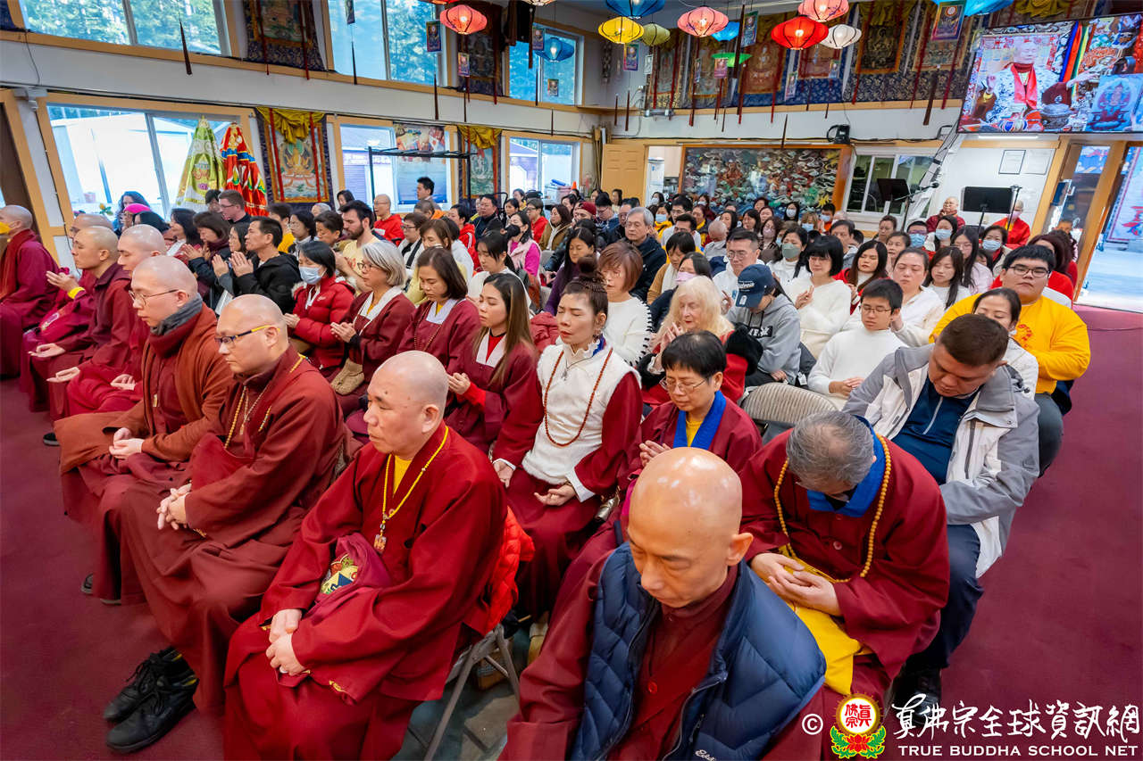 法王開示畢,衆人報以熱烈掌聲感謝。接著法王下座與綫上弟子互相問候,並為與會大衆賜授彌勒菩薩法灌頂。法會至此圓滿結束。