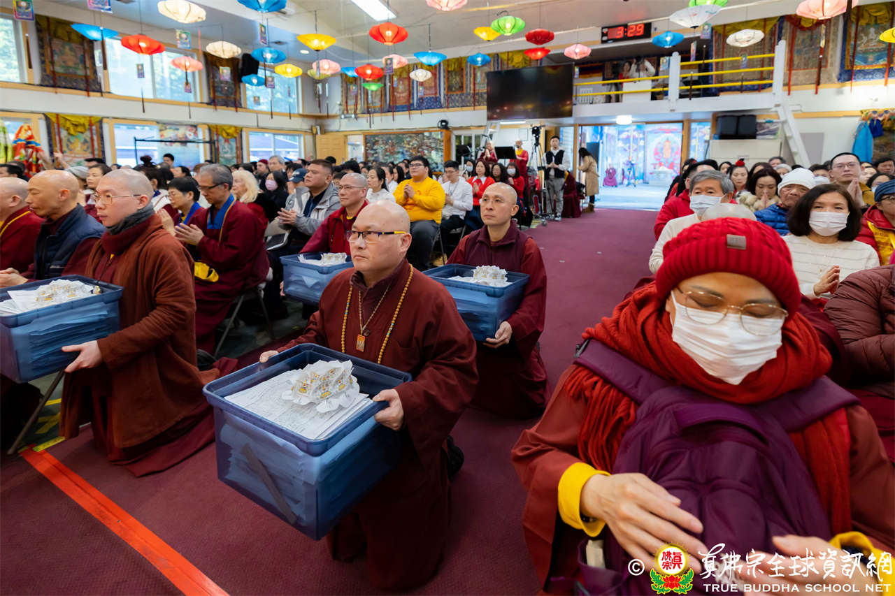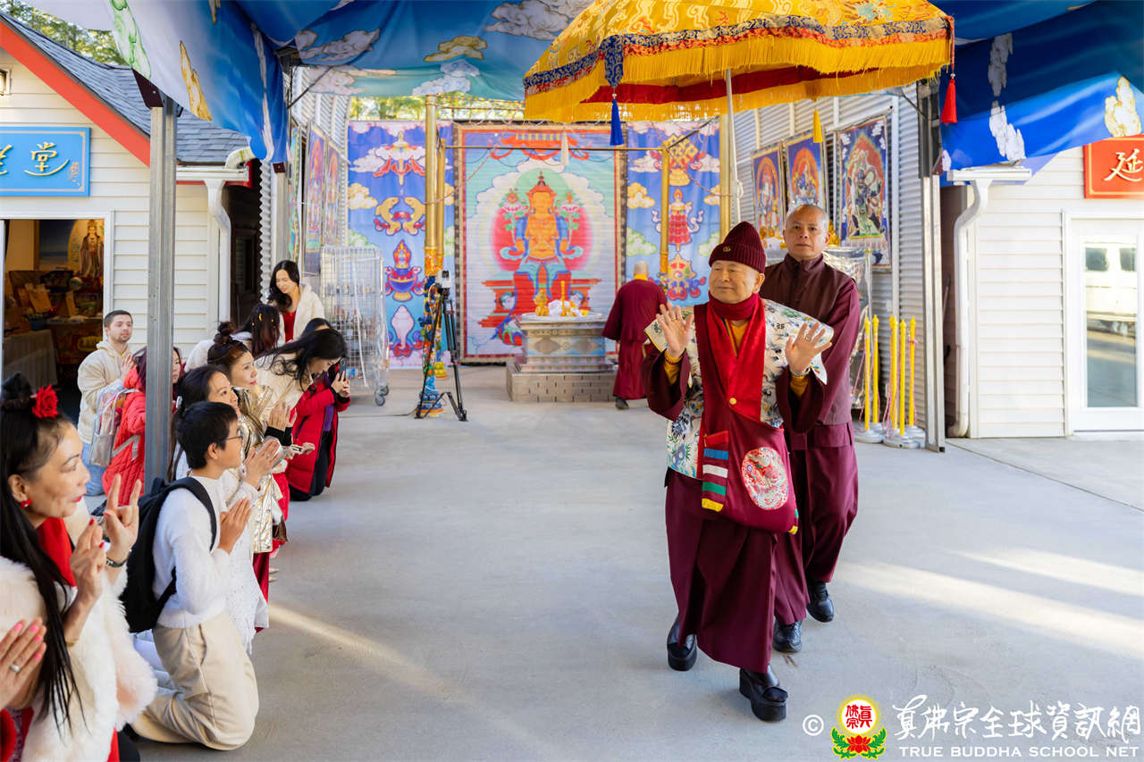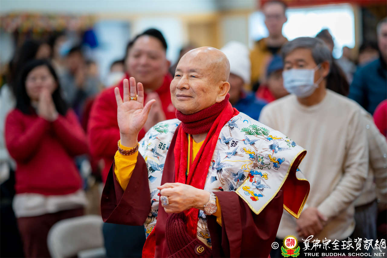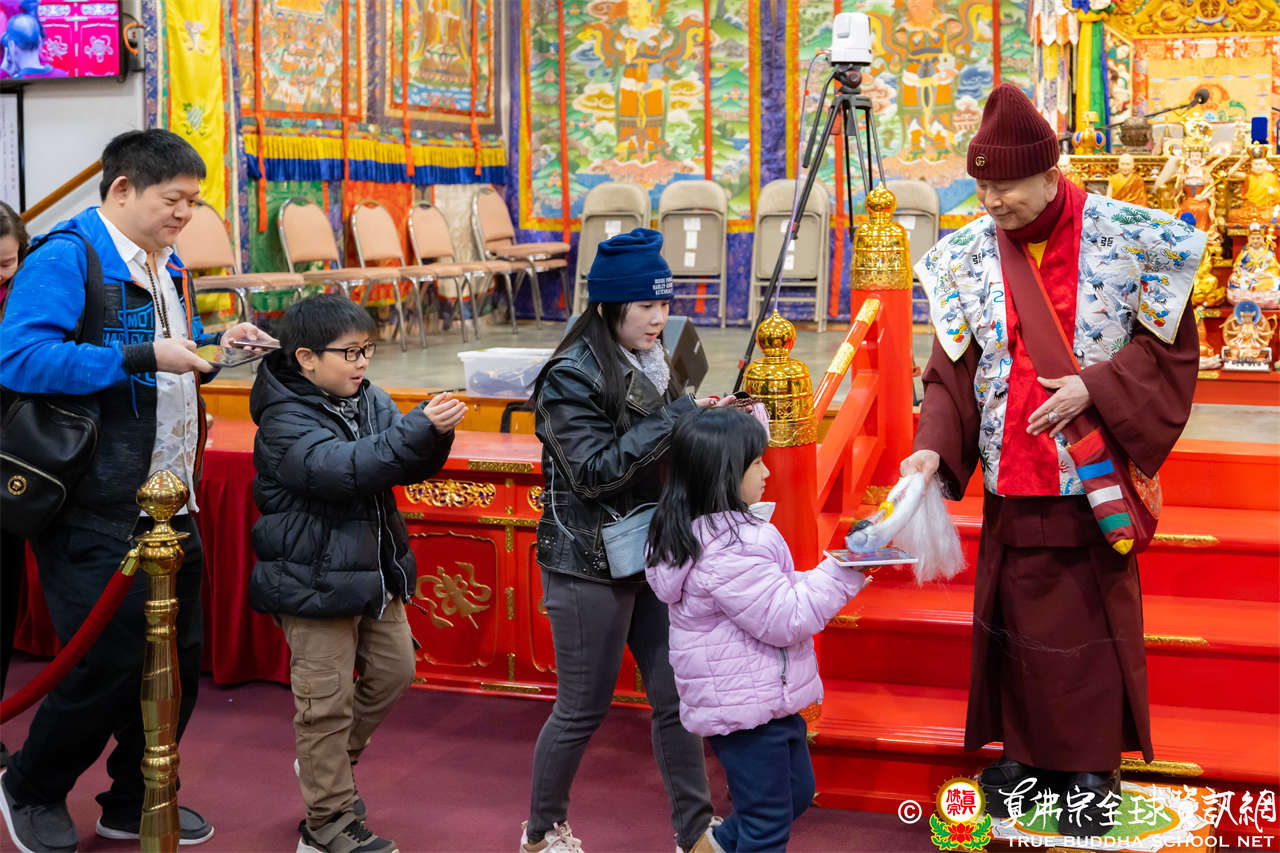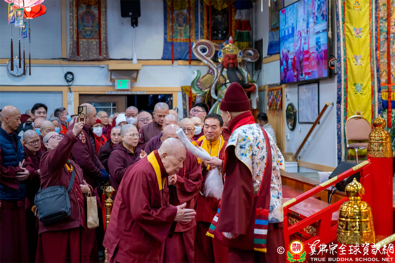 法王開示畢,衆人報以熱烈掌聲感謝。接著法王下座與綫上弟子互相問候,並為與會大衆賜授彌勒菩薩法灌頂。法會至此圓滿結束。