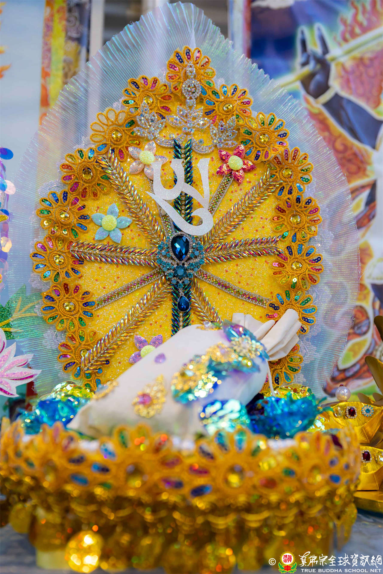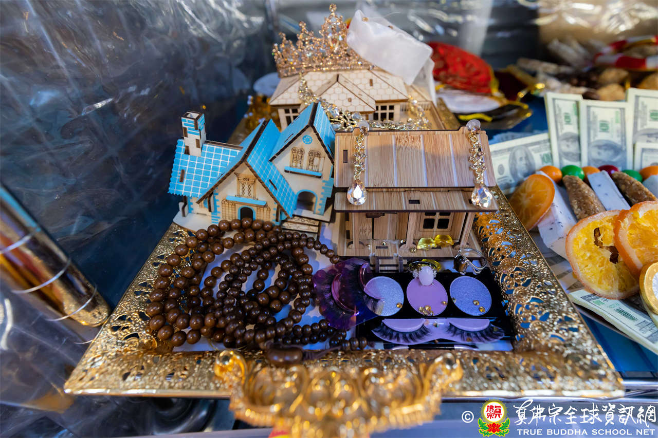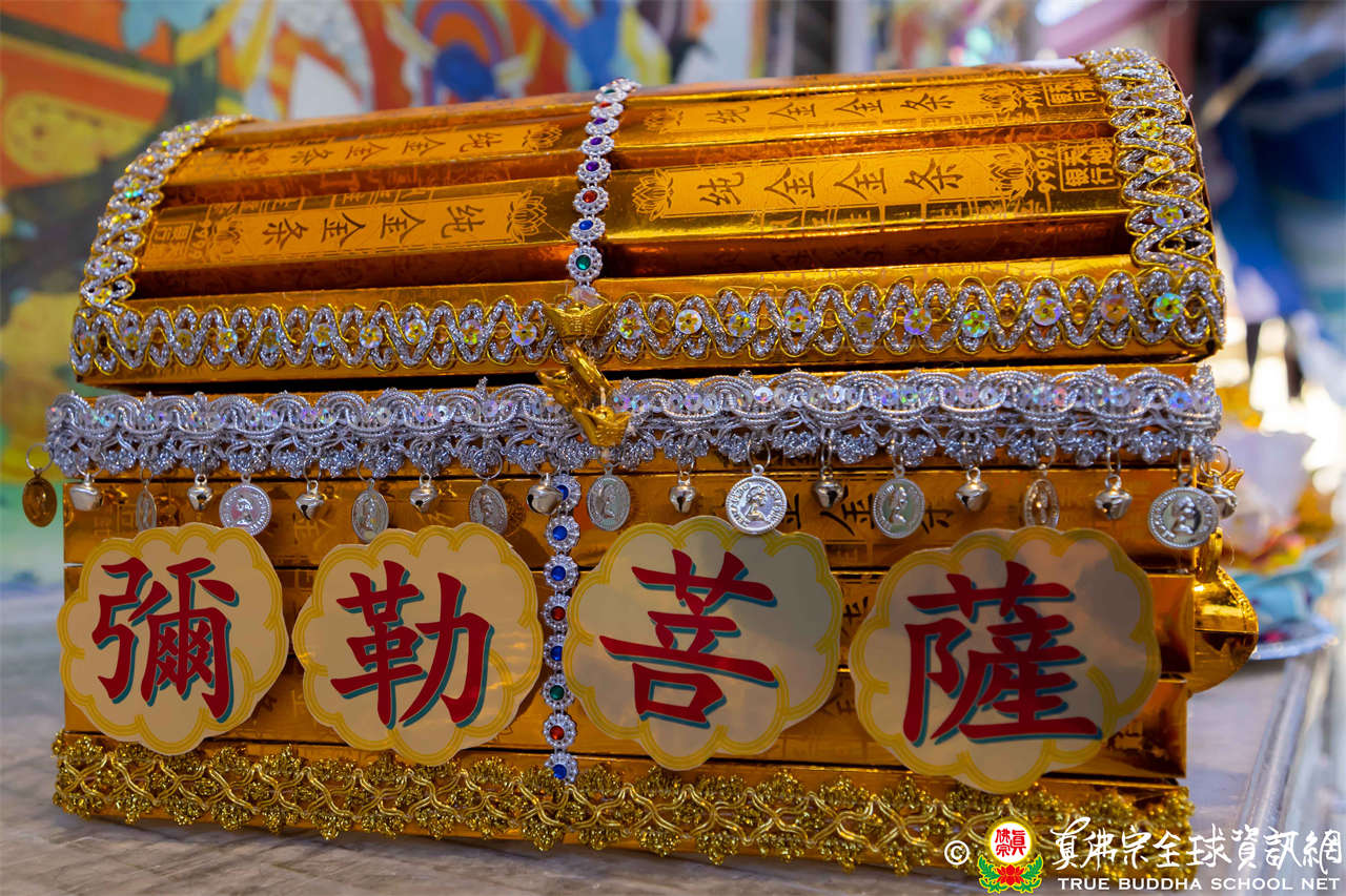 接著法王介紹法會主尊彌勒菩薩,釋迦牟尼佛在世時,授記彌勒菩薩為未來的大權神王佛,未來將從兜率天內院下降到娑婆世界,在龍華樹下舉行三個很大的法會,廣度人天。其手印是轉法輪印,意即未來的法輪將由彌勒菩薩來轉。法王也憶起昔日初到西雅圖巴拉,生活困頓得向佛菩薩哭訴。於是彌勒菩薩從虛空中把祂的布袋打開,掉下了房子、車子、土地、鈔票黃金、喇嘛裝、龍袍、法王冠、,七珍八寶。因彌勒賜福,後來法王也就慢慢一一具足了各種資糧。