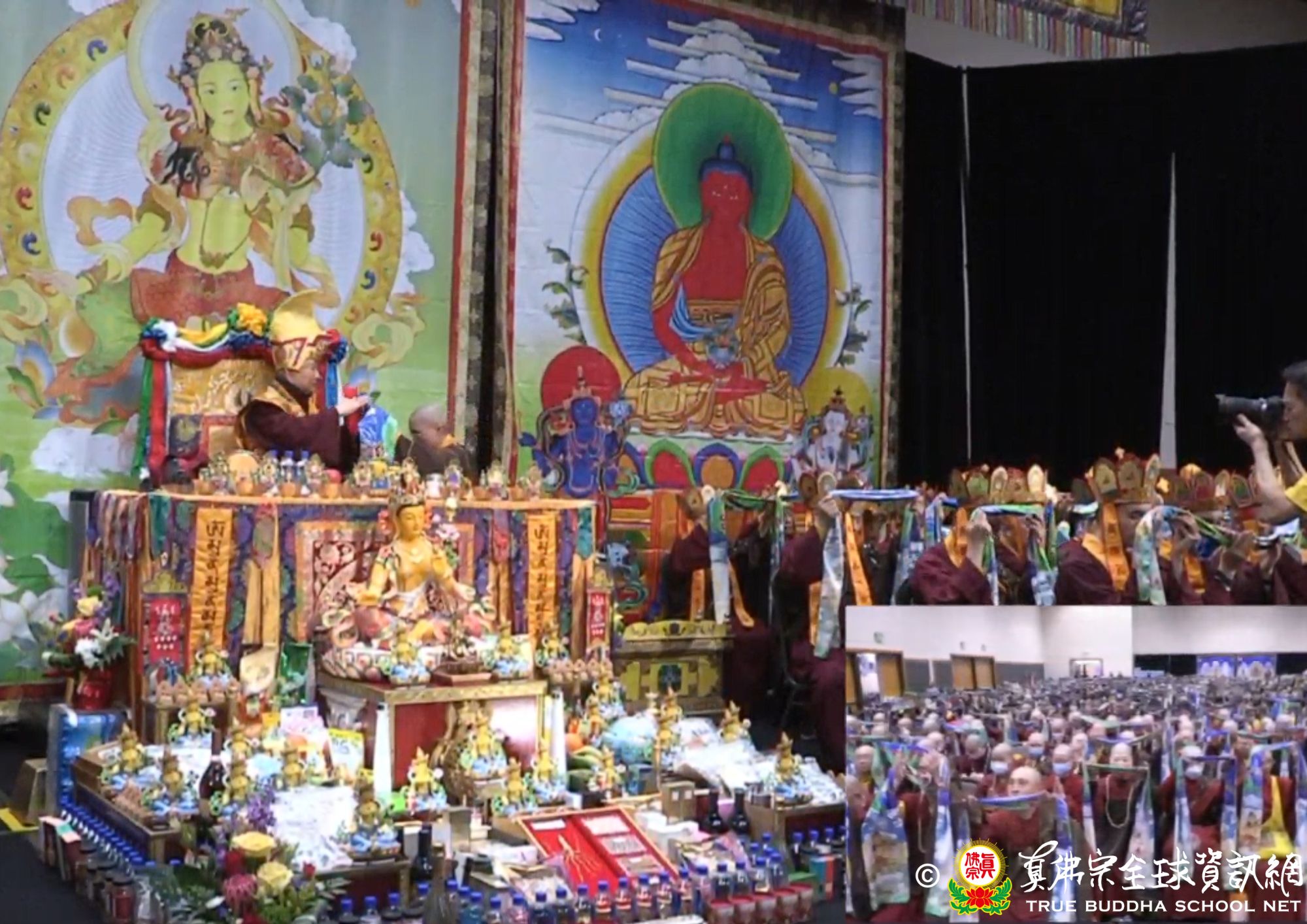 法會開始,聖尊為發心出家的法師進行出家戒授戒剃度儀式,為在家修行人授菩薩戒,以及為新婚的情侶福證。