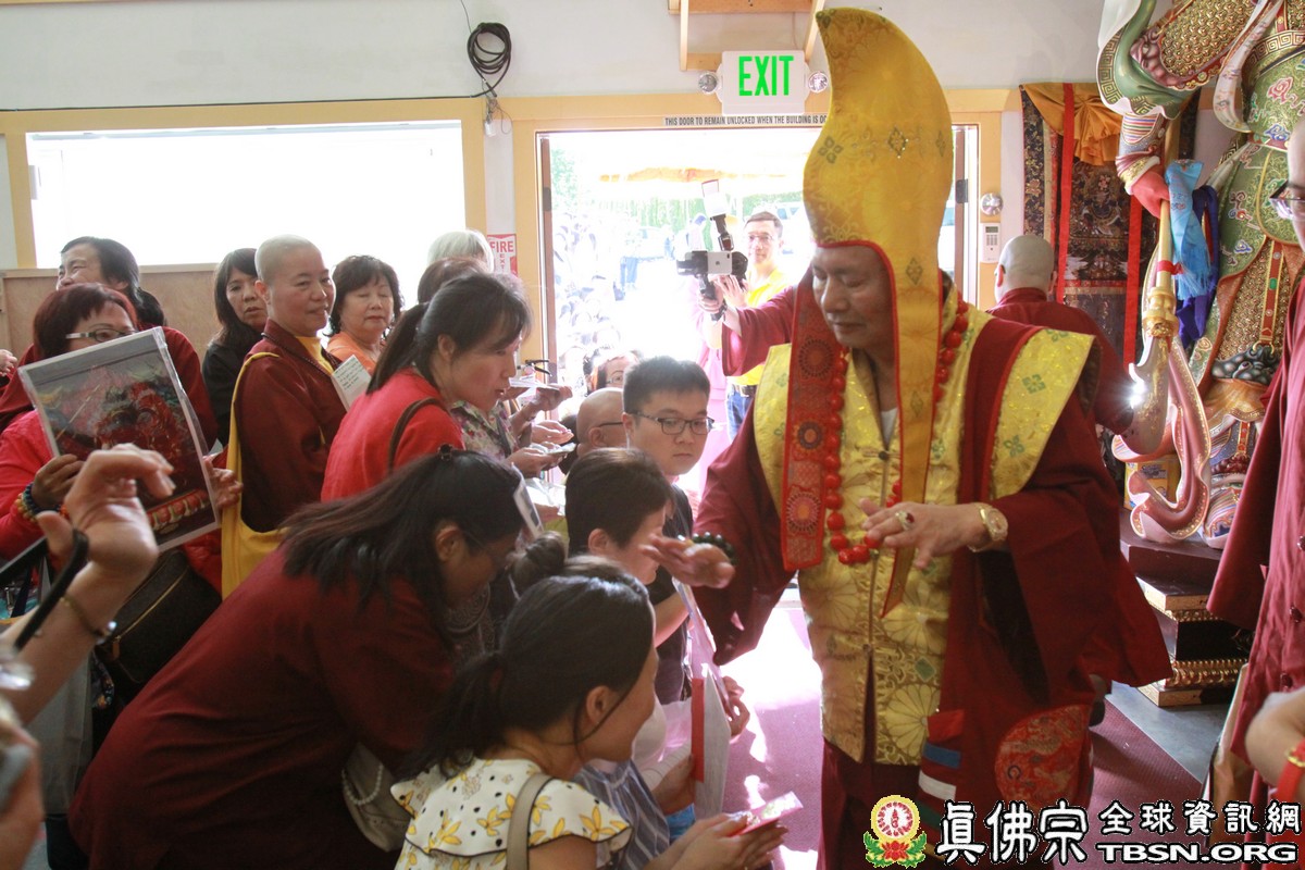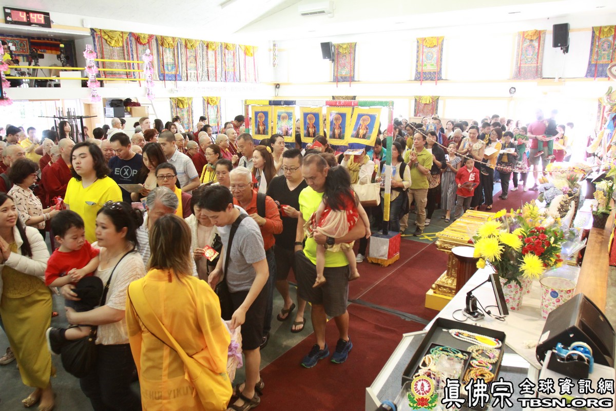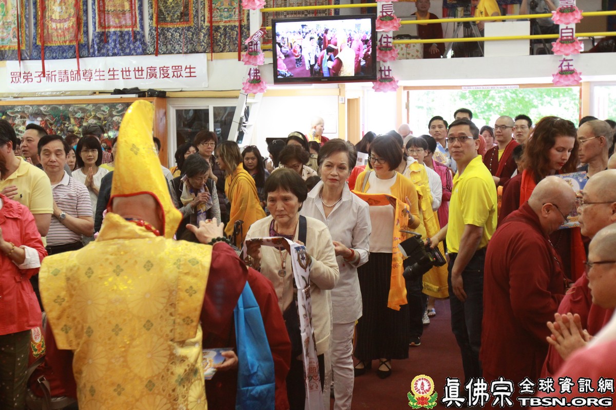 是日,護摩寶殿一大早就座無虛席,廖東周大使伉儷也出席參加,中午12點,四眾弟子熱情溫馨地恭迎法王聖尊進入大飯店共進午餐,此次的午餐加洲四大媽特地在用餐時供養了很多的笑話,逗得師尊及大家樂開懷,笑聲連連。