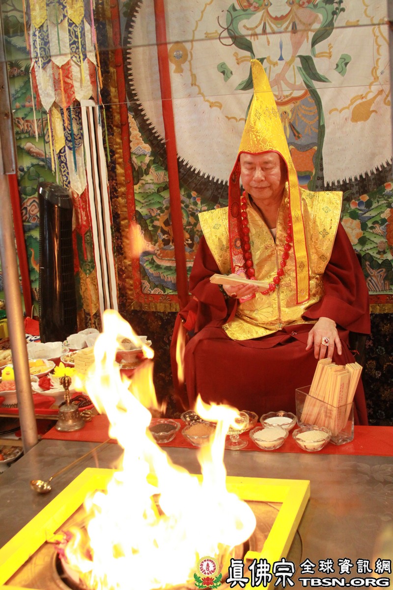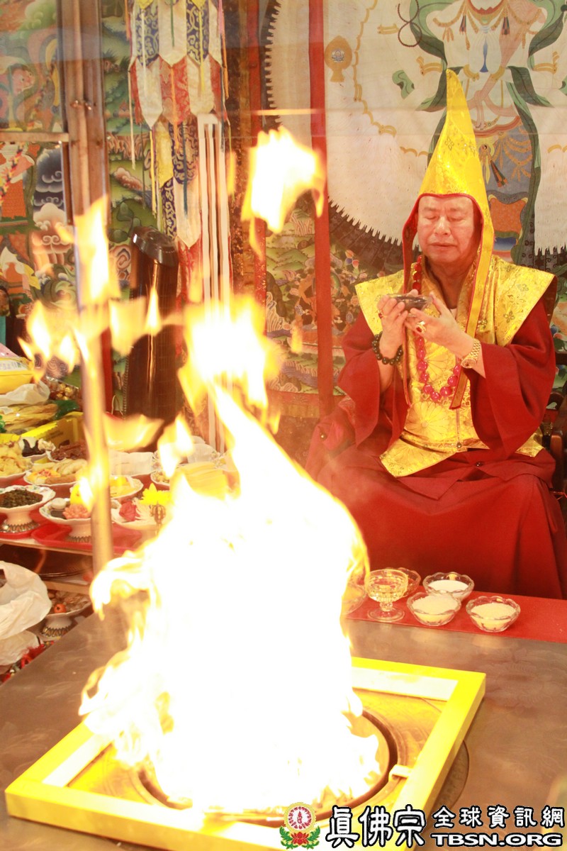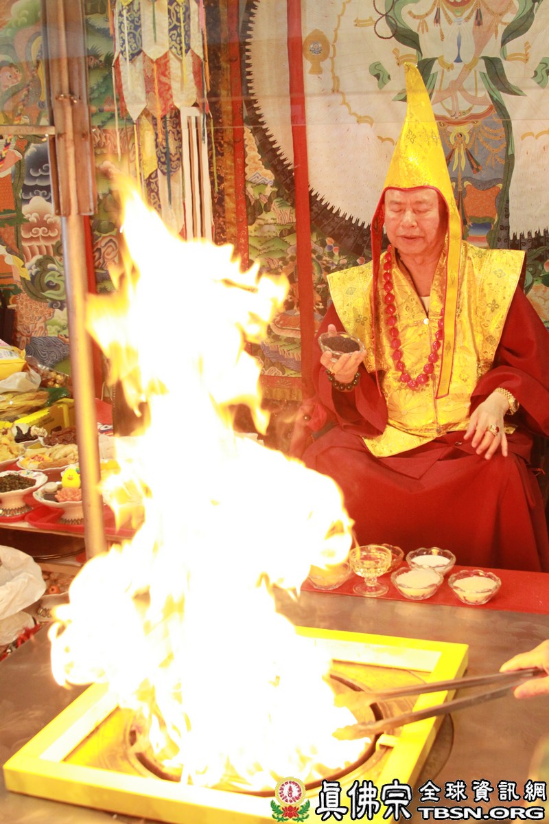 下午三時,法會正式開始,四眾弟子恭迎聖尊蓮生法王及上師團法駕護摩寶殿。法會進行期間,聖尊演化優美殊勝的手印,現場靈氣充滿,威力曼妙的「嗡。金母悉地。吽。」咒音,響徹整個護摩殿;行者、火與本尊,三者融合為一,讓所有參加者在熊熊的護摩火焰中,淨化一切身心的業障。