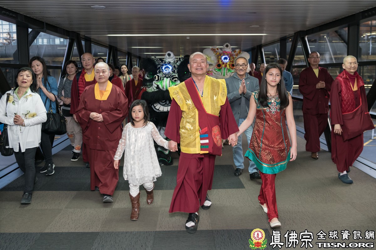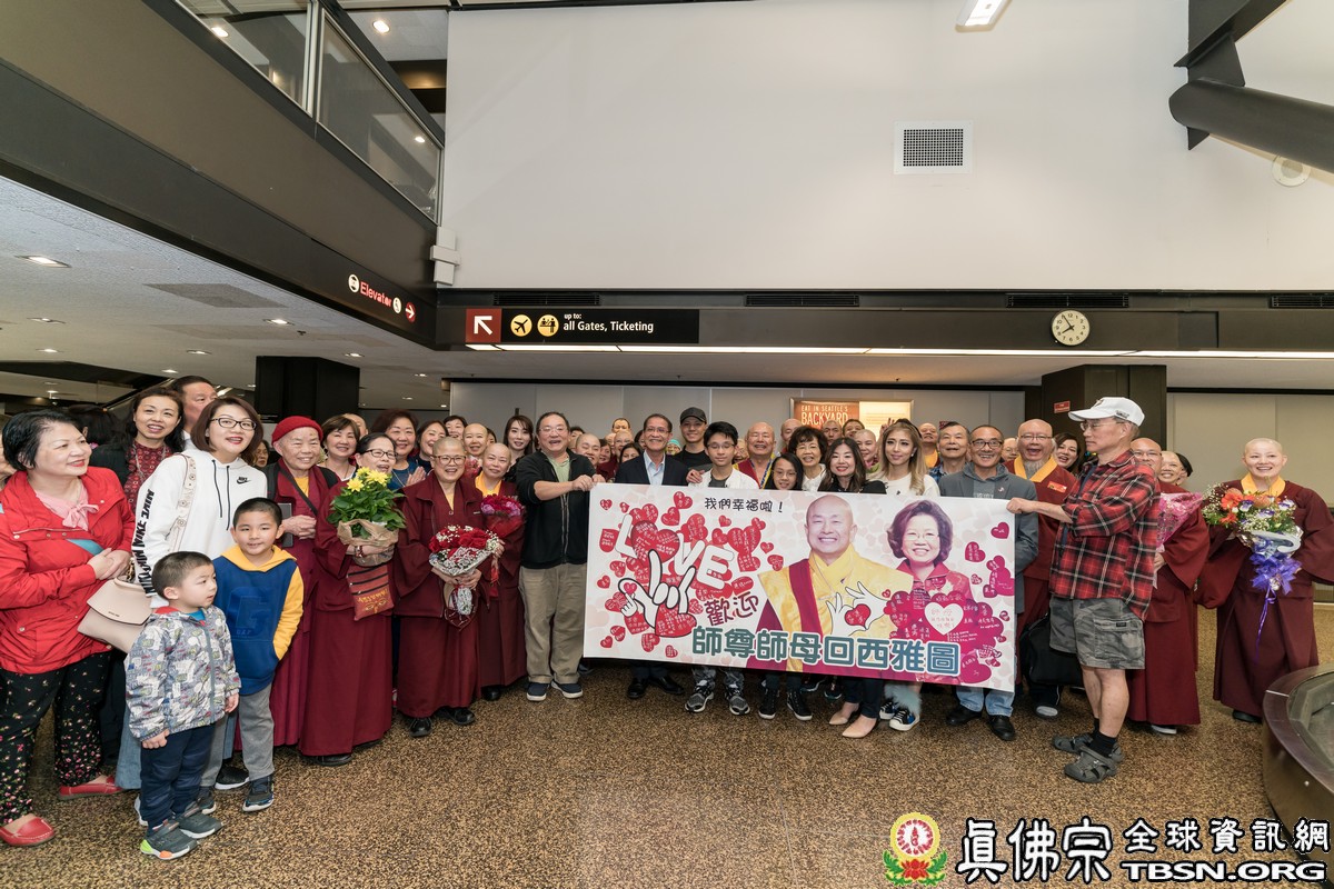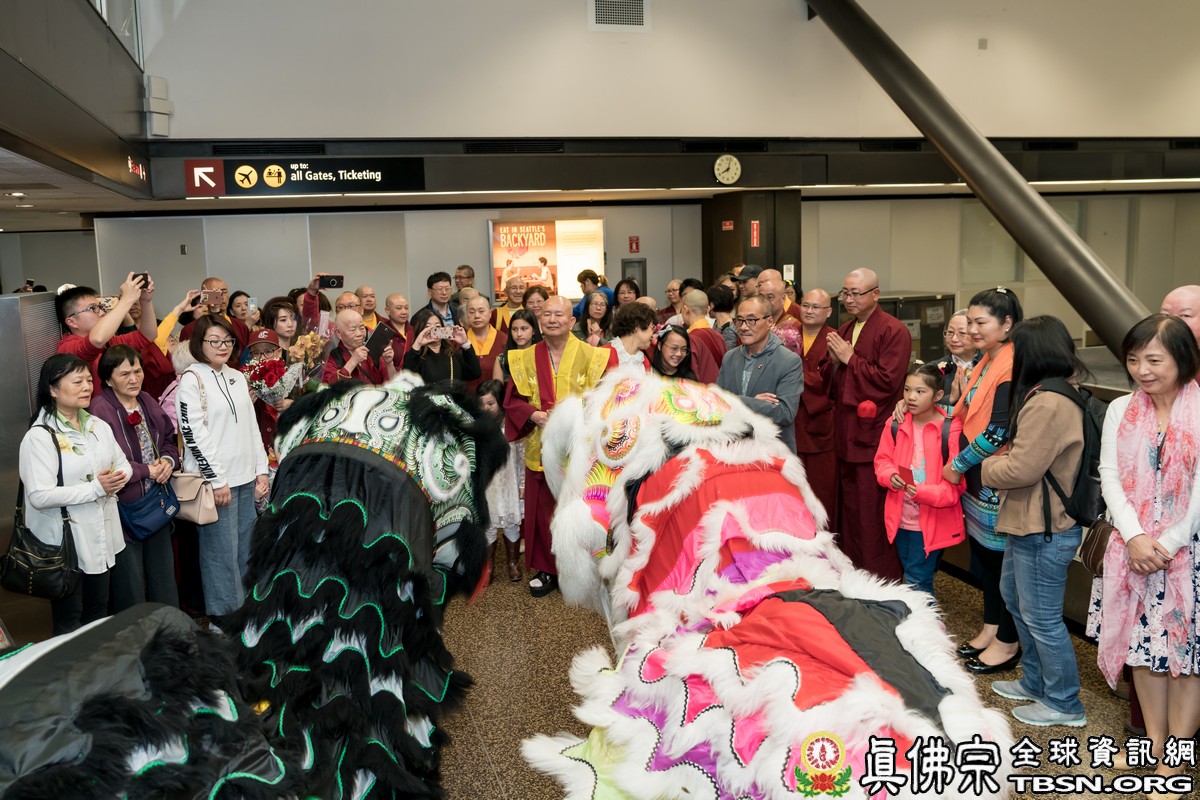 當師尊、師母出現的那一剎,激動的心、熱烈的掌聲,感覺血是沸騰的,心是高漲的。師尊、師母那熟悉的慈愛笑容、親切的問候,讓大家久久感動不已。廖東周大使伉儷,也聯袂特地從加州趕到西雅圖機場來迎接師尊、師母,西雅圖中國城的麥顯輝師父也親自領了醒獅隊,在機場敲鑼打鼓、舞動雄獅。許多機場的旅客都駐足觀望,甚至拿手機拍照錄影,有幸見聞這親切熱鬧的場面。