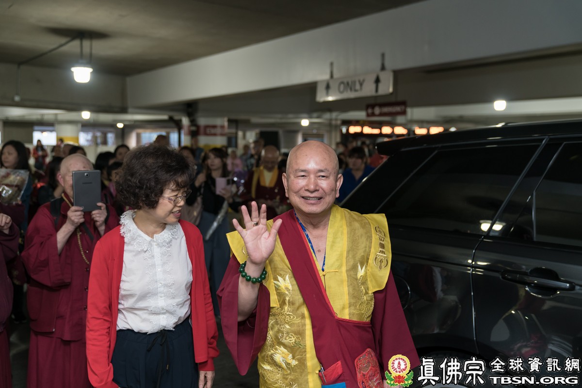 許多弟子一一上前獻花給師尊、師母,大家留影團體大合照。師尊、師母也與久違的家人和孫子一一相互擁抱,現場充滿一片孺慕的溫馨。師尊、師母一路和大家揮手致意,大家一路簇擁著到達停車場。上車前,師尊、師母與大家道別,相約明天到祖廟見。