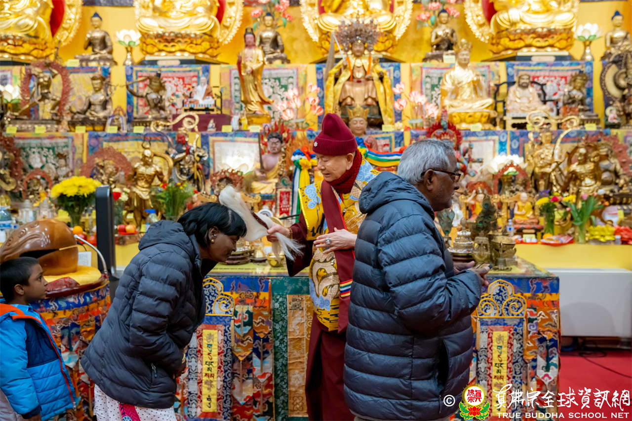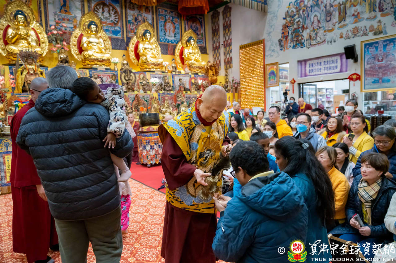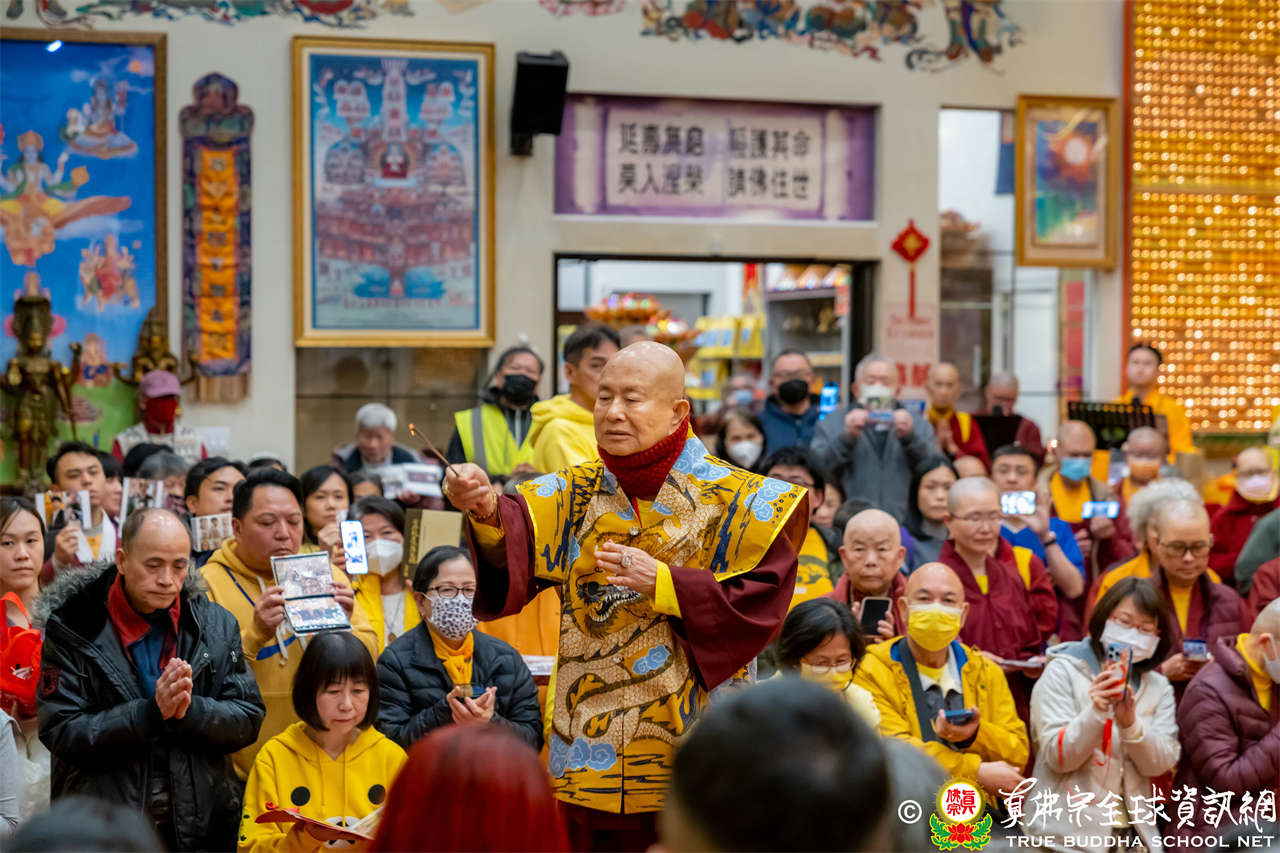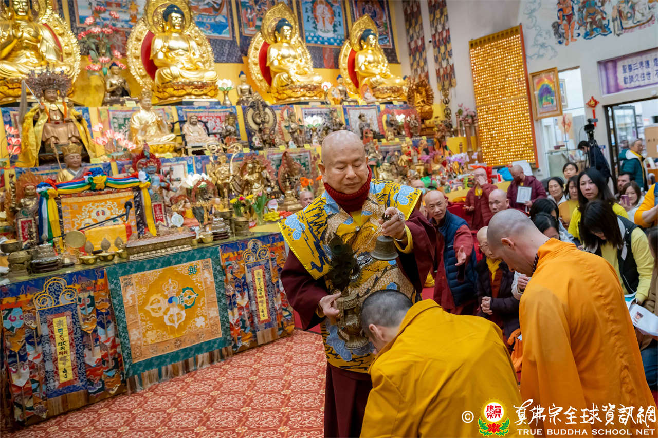 聖尊精彩寶貴的法語開示後,慈悲為新皈依弟子做皈依灌頂,然後加持大悲咒水、開光佛像,最後持拂塵一一加持與會大眾。