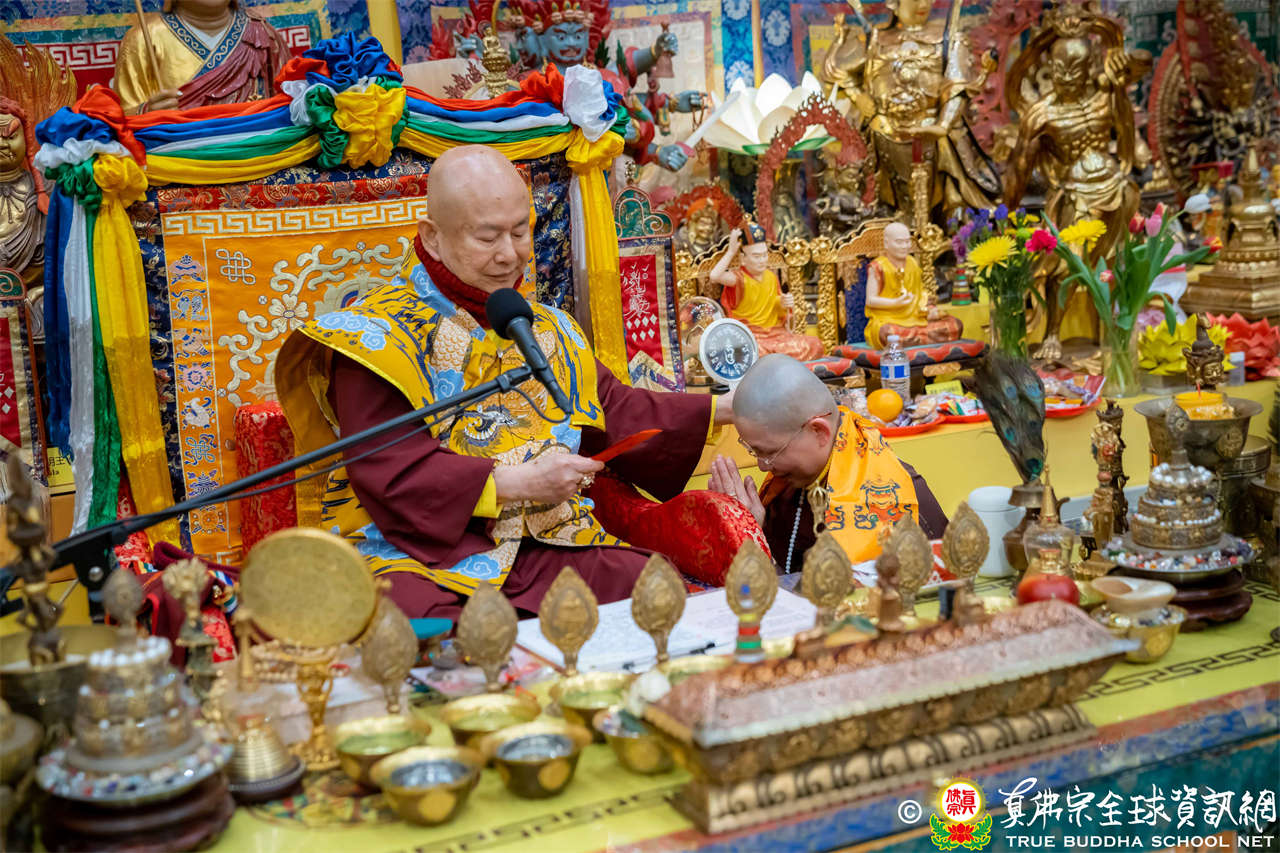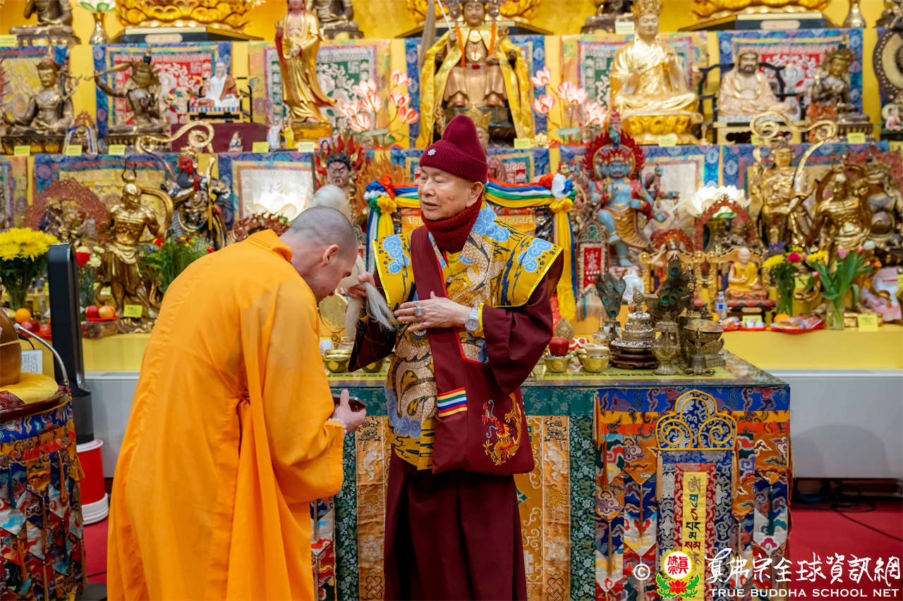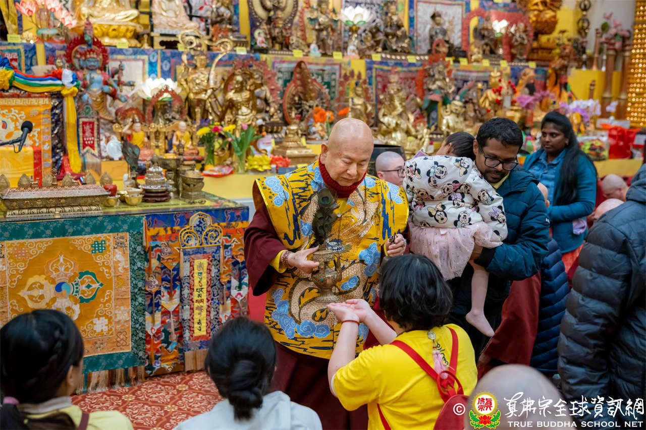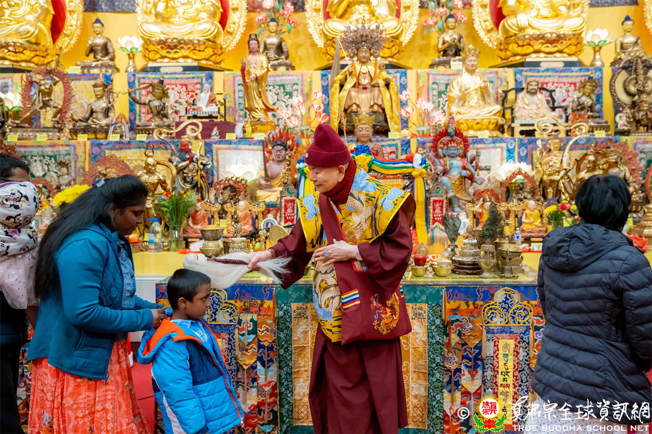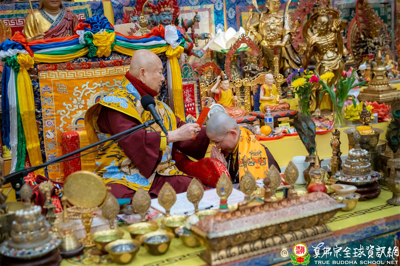聖尊精彩寶貴的法語開示後,慈悲為新皈依弟子做皈依灌頂,然後加持大悲咒水、開光佛像,最後持拂塵一一加持與會大眾。