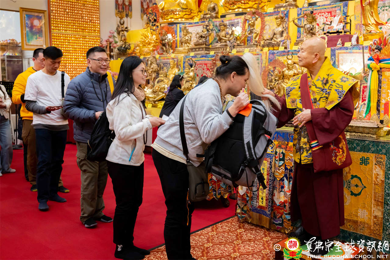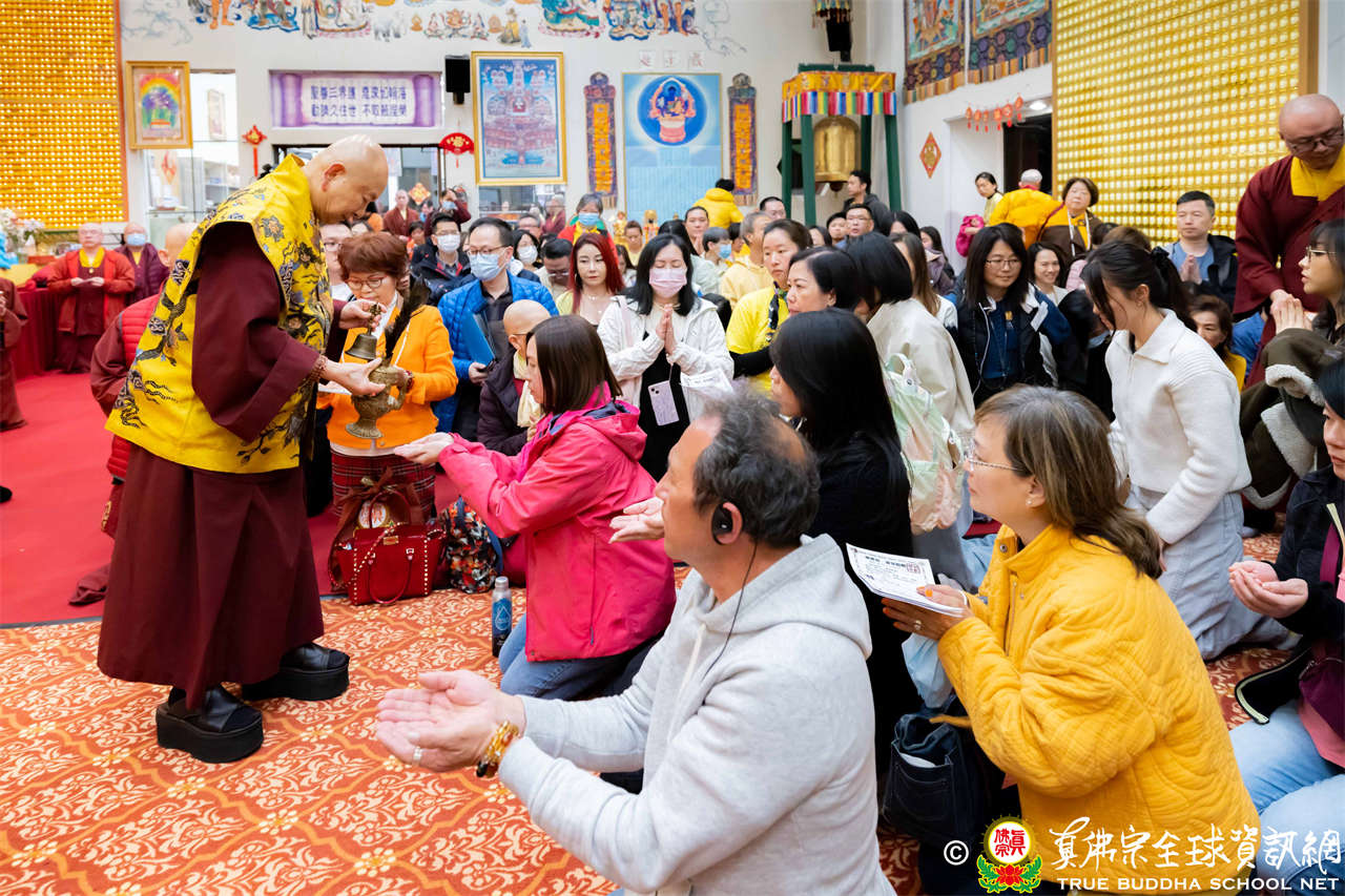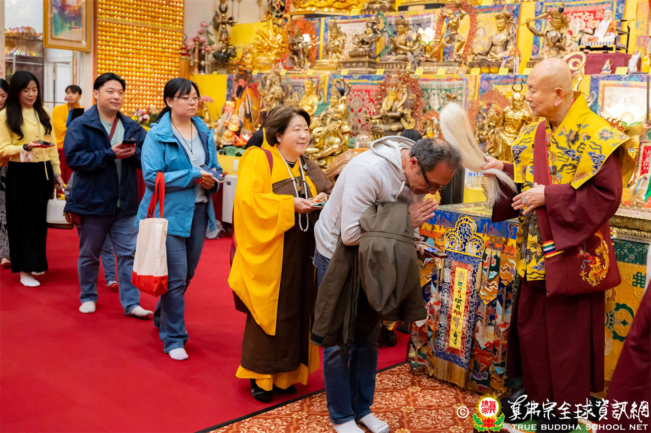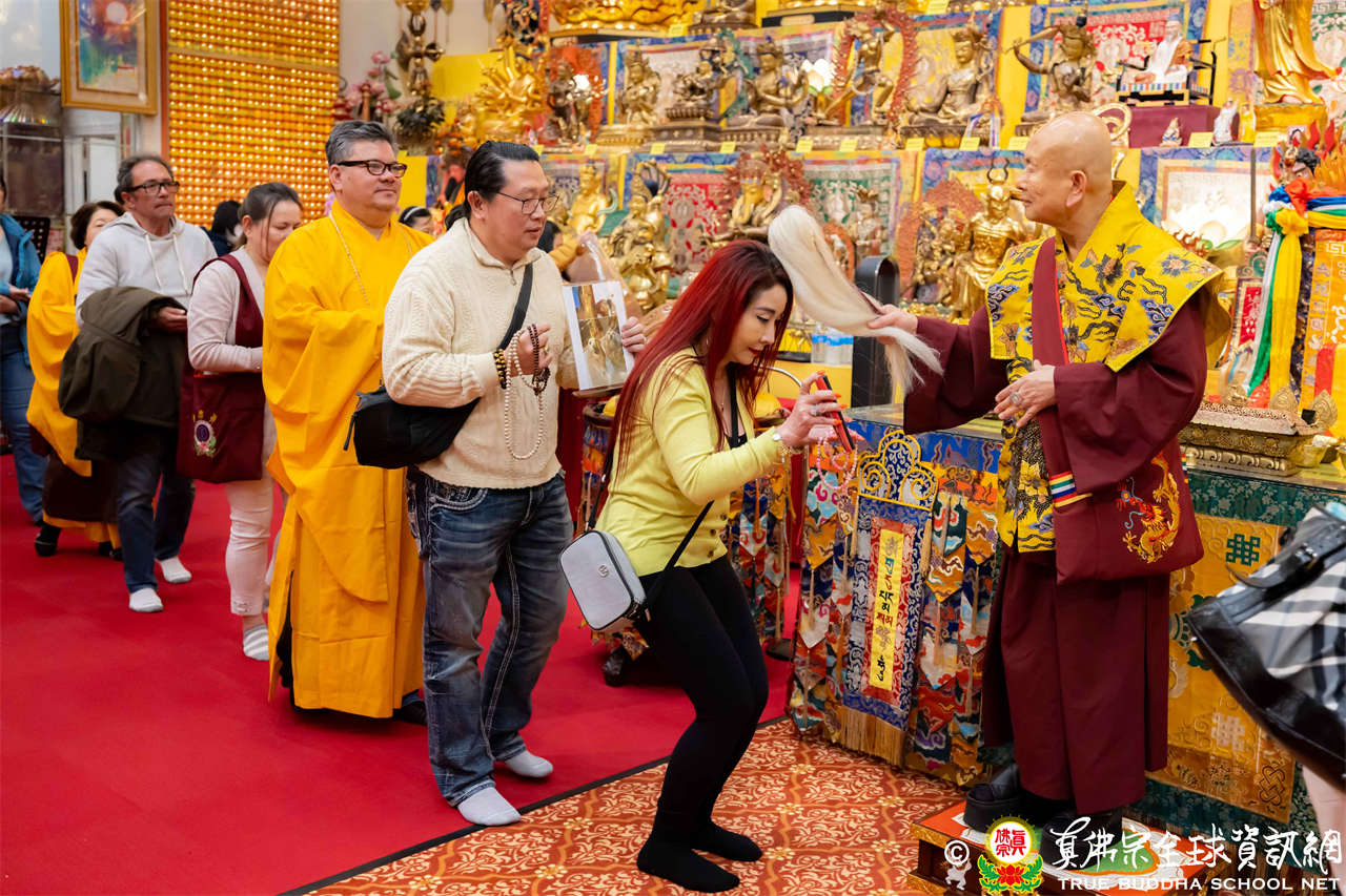 聖尊精闢寶貴的法語開示後,慈悲為新皈依弟子做皈依灌頂,然後加持大悲咒水,開光佛像,最後持佛麈一一加持與會大眾。
