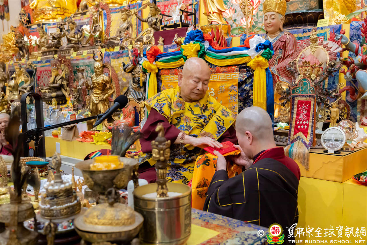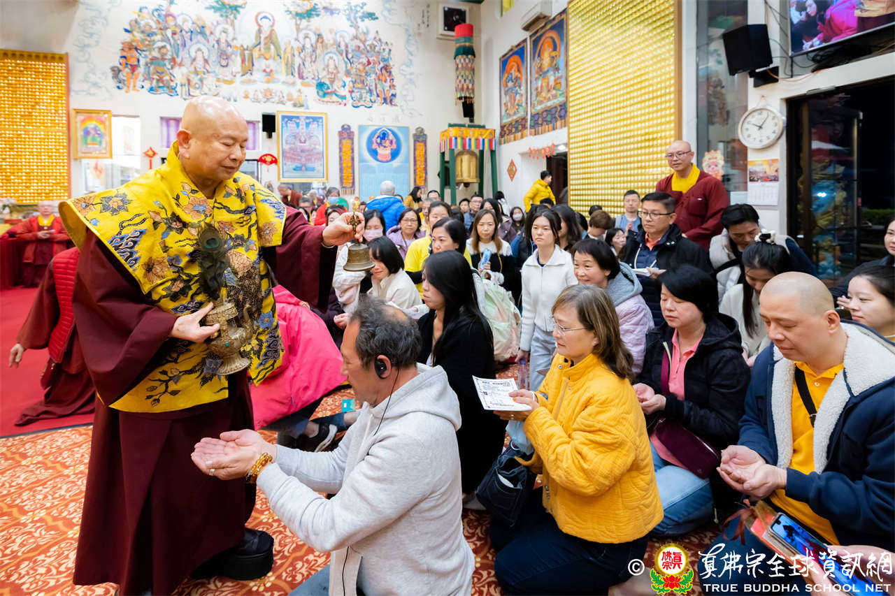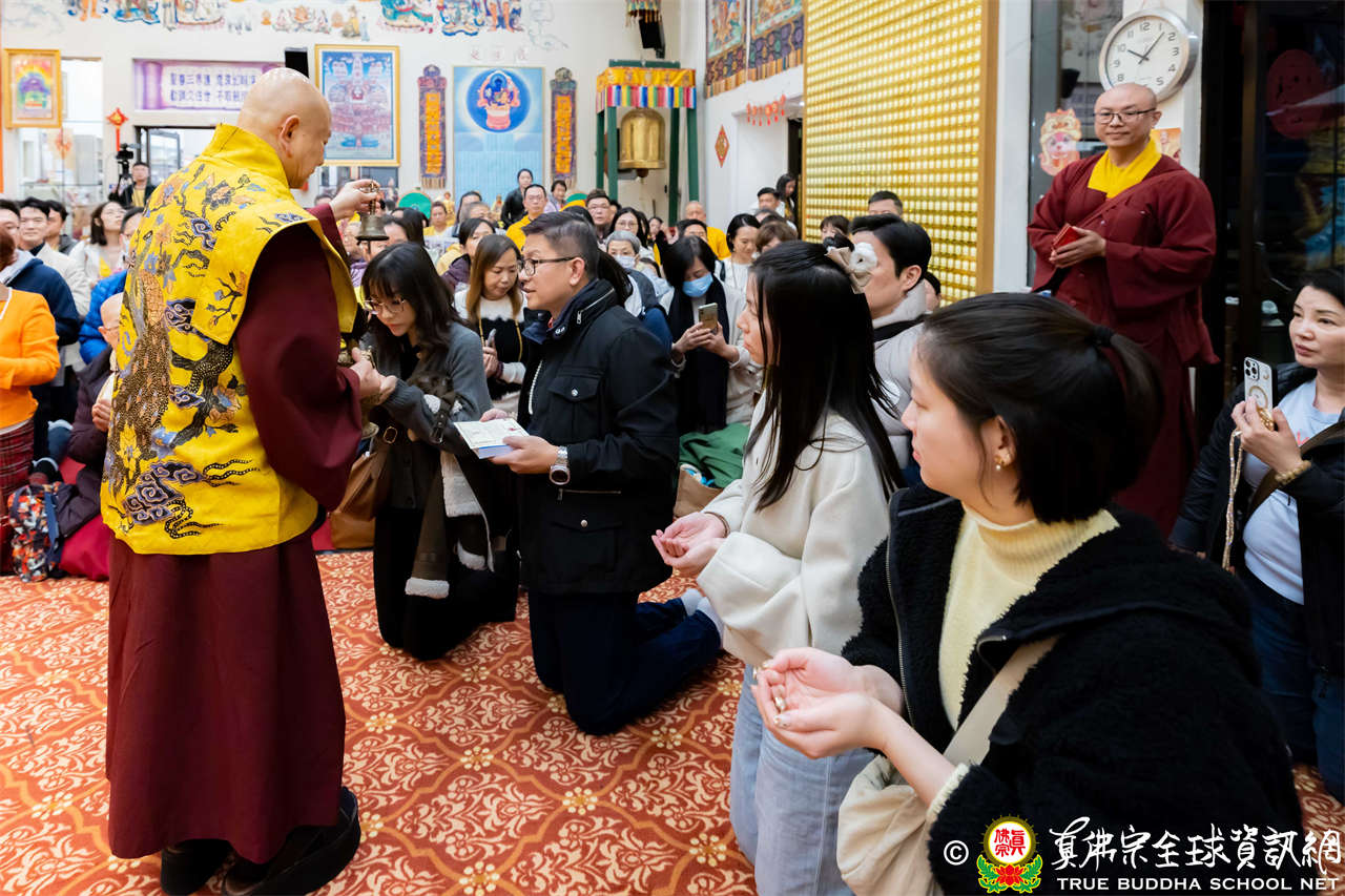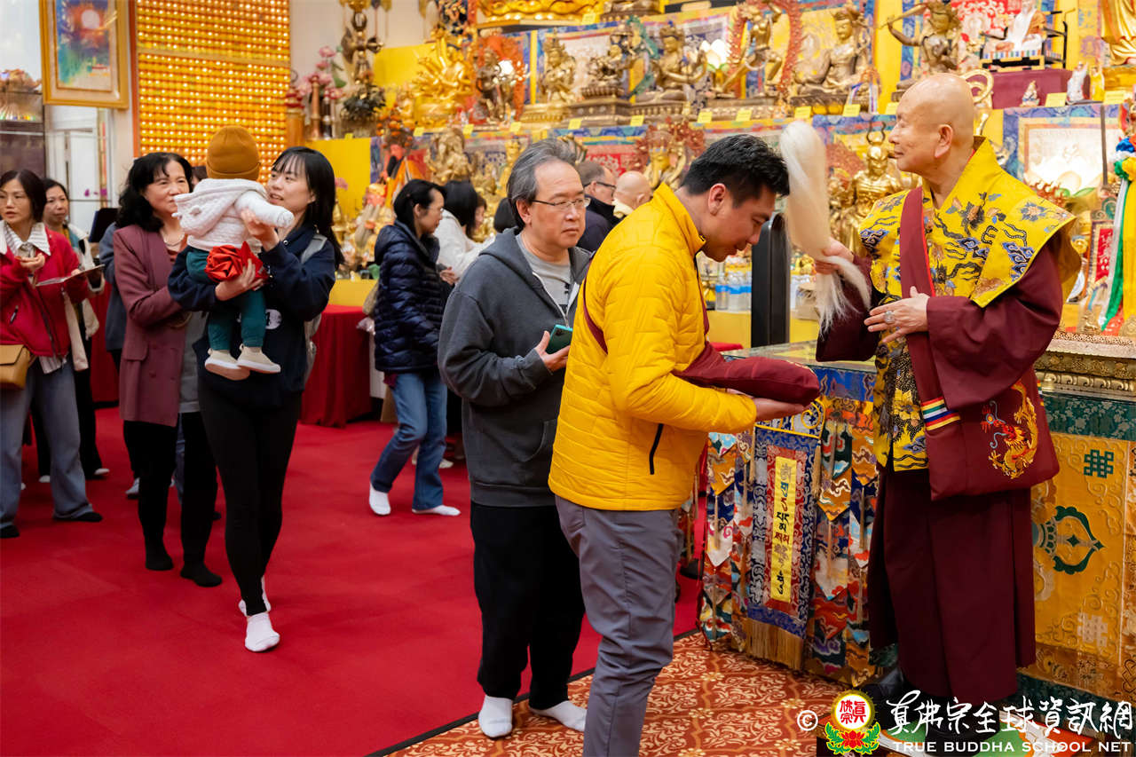 聖尊精闢寶貴的法語開示後,慈悲為新皈依弟子做皈依灌頂,然後加持大悲咒水,開光佛像,最後持佛麈一一加持與會大眾。