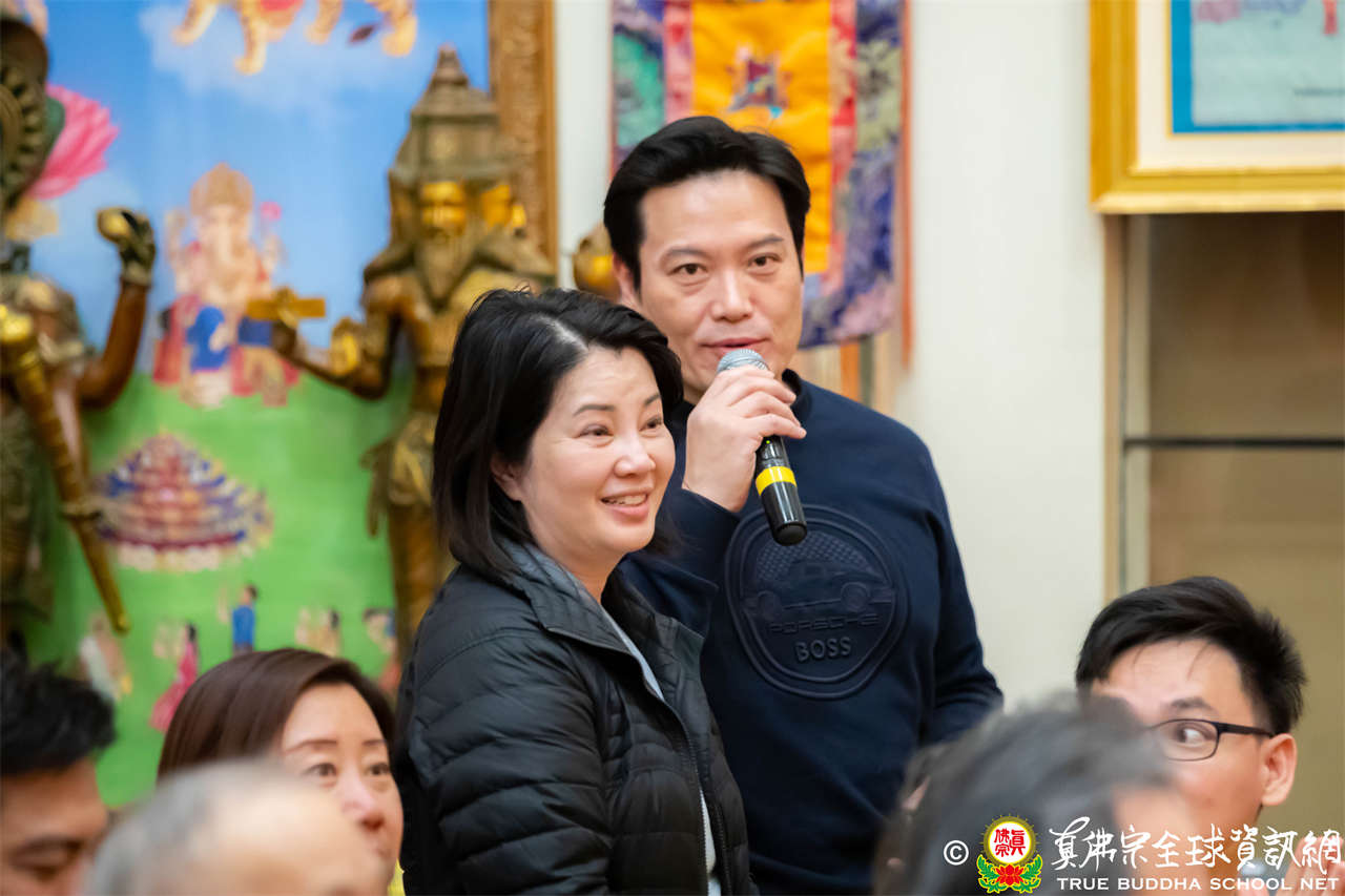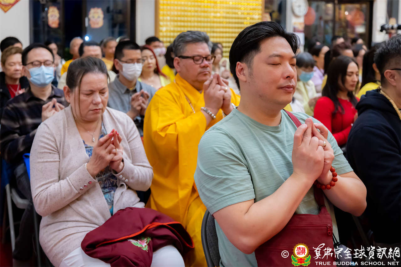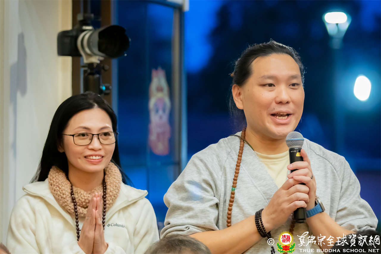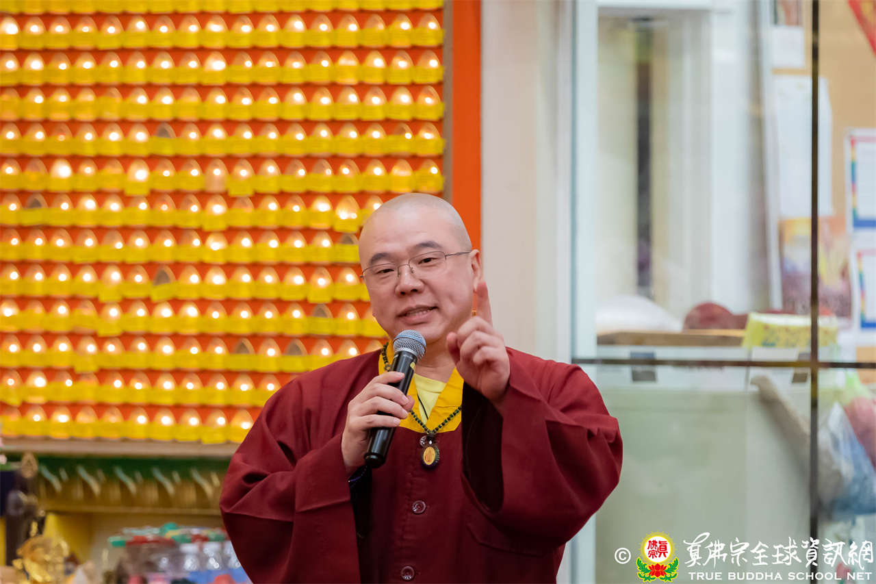 聖尊精闢寶貴的法語開示後,慈悲為新皈依弟子做皈依灌頂,然後加持大悲咒水,開光佛像,最後持佛麈一一加持與會大眾。