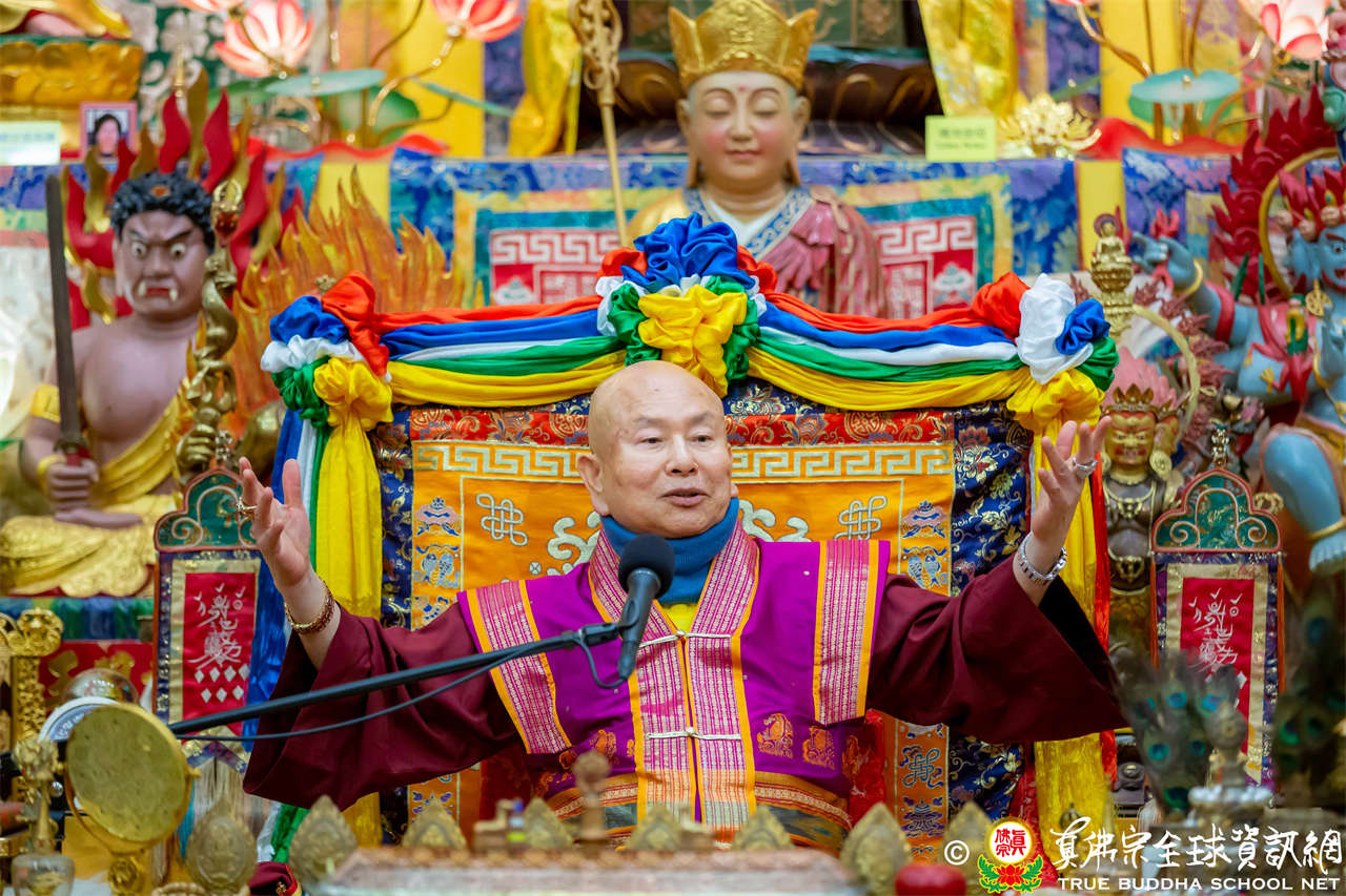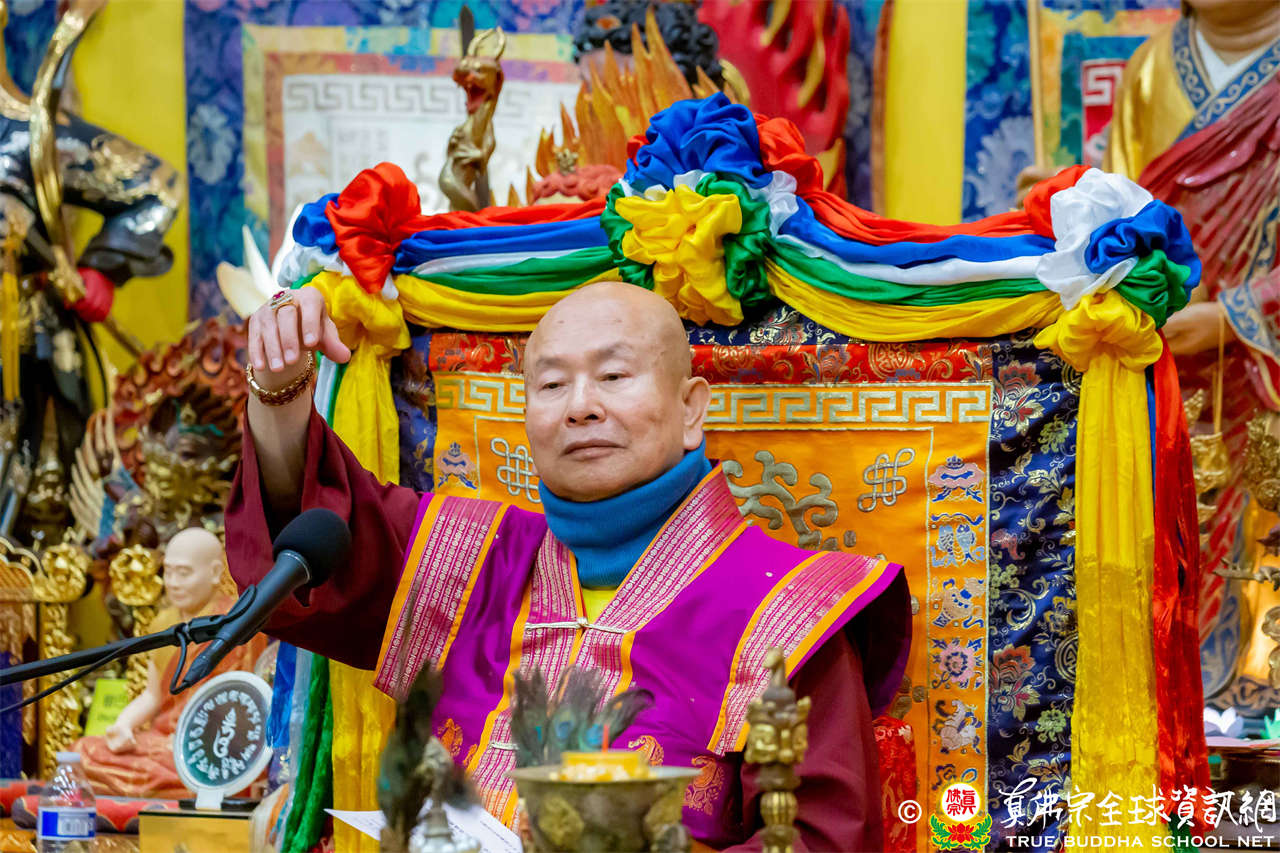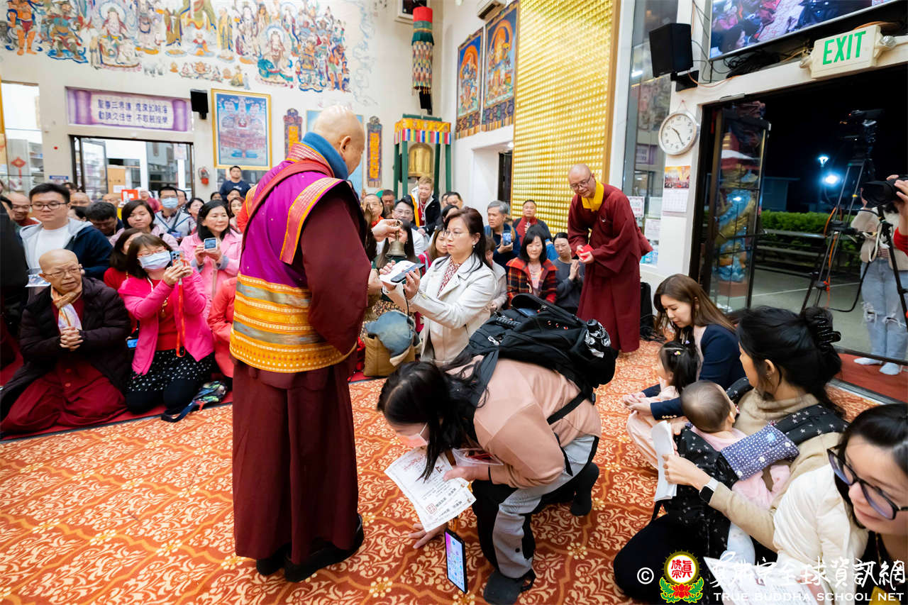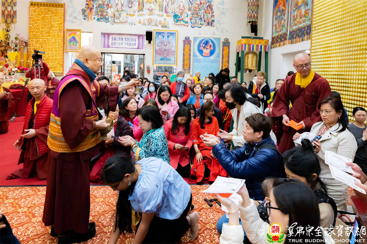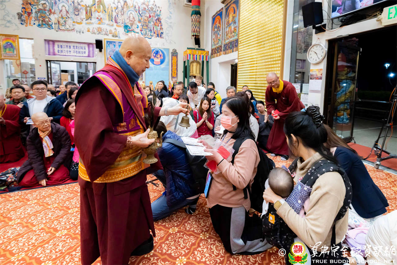 在講述楞嚴經後,聖尊為求皈依的信眾賜授皈依灌頂,加持大悲咒水及開光佛像,並以拂塵加持與會大眾。聖尊教導佛法真義,四眾弟子心開意解,法喜充滿,蓮華生大士的加持與顯現亦令與會眾等歡欣鼓舞,只要敬師重法、實修不懈,蓮師常在,佛光永照。