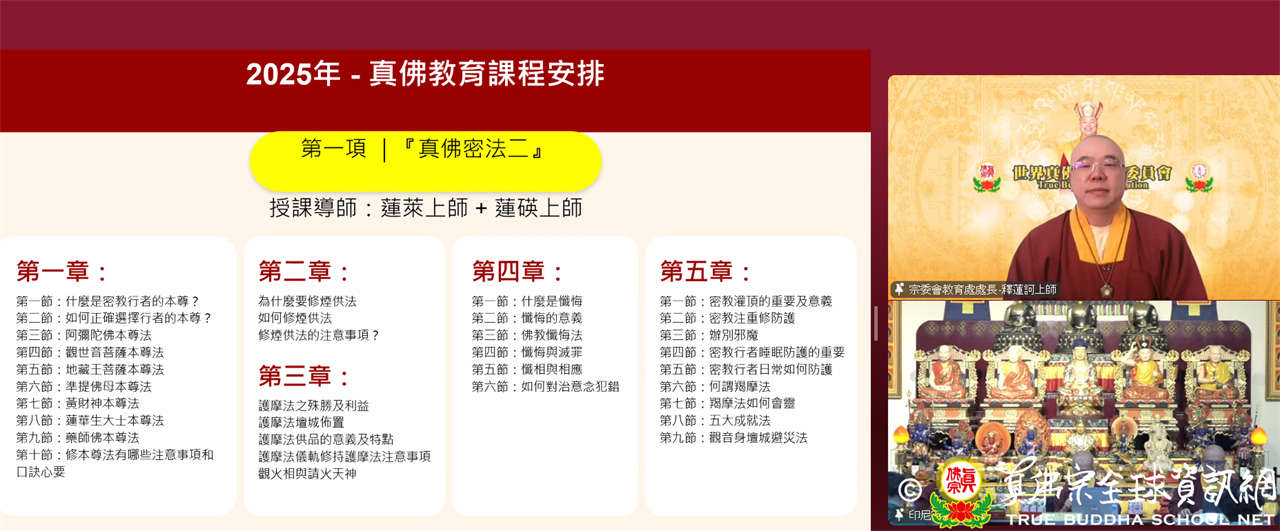 除了在家眾的學習,亦規劃上師進修班,課程含括戒律、真佛密法、羯摩法、風水…五部大論等。法師進修班-「圓滿證悟的啟程」則為2025-2030為期五年的課程規劃,是給法師、新出家、準備出家的僧眾學習內容。