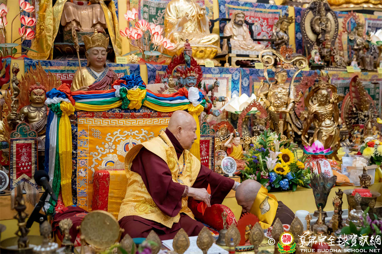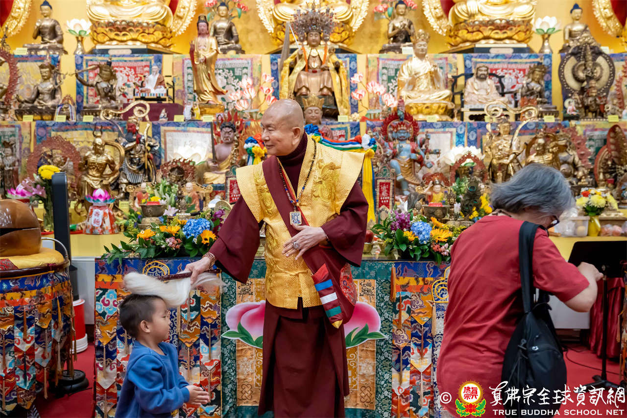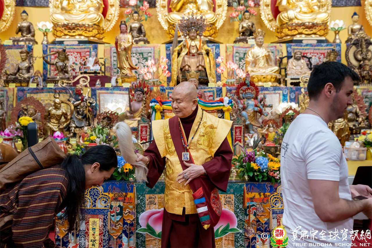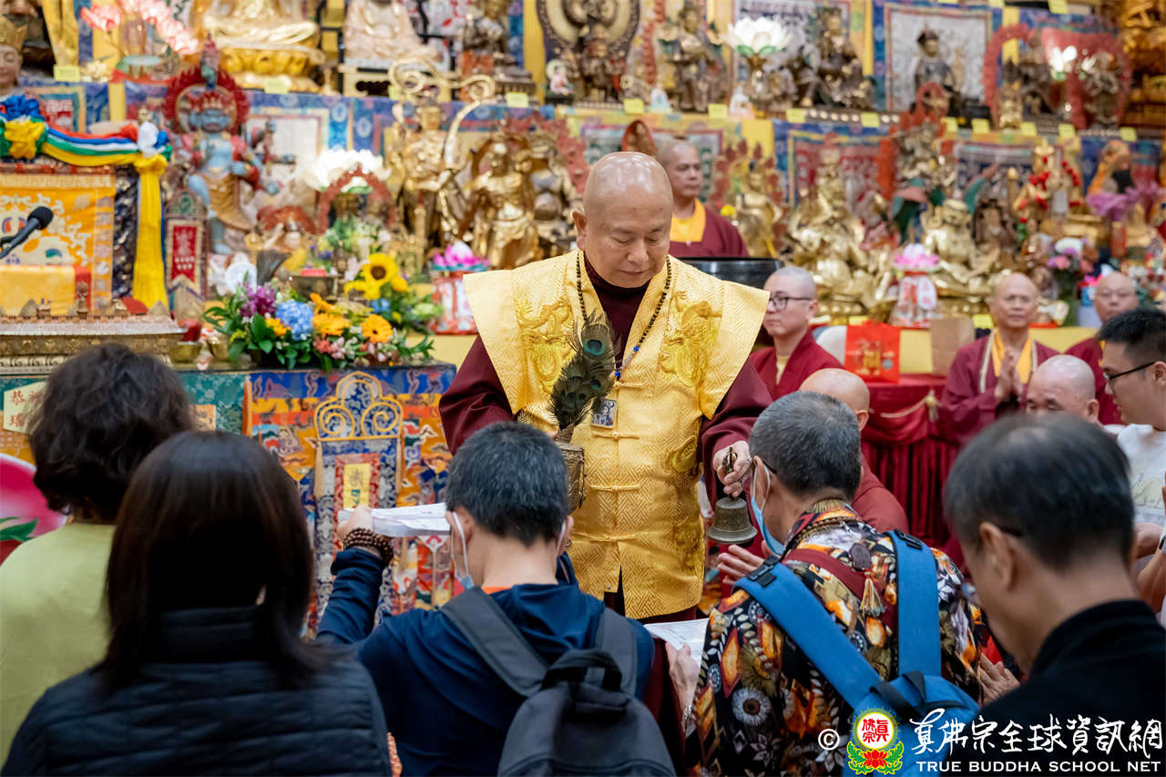 聖尊精闢寶貴的法語開示後,慈悲為新皈依弟子做皈依灌頂,然後加持大悲咒水,開光佛像,最後持拂塵一一加持與會大眾。