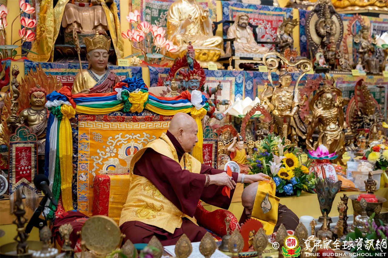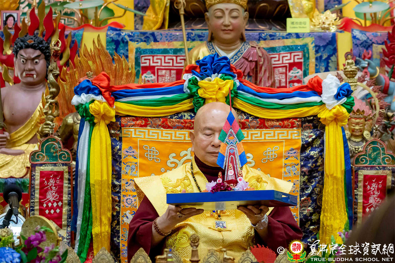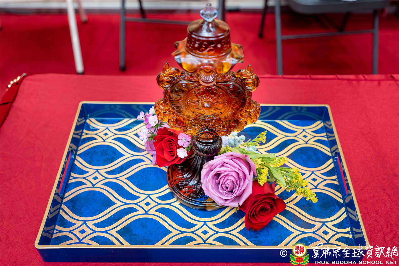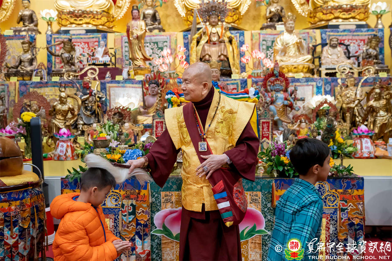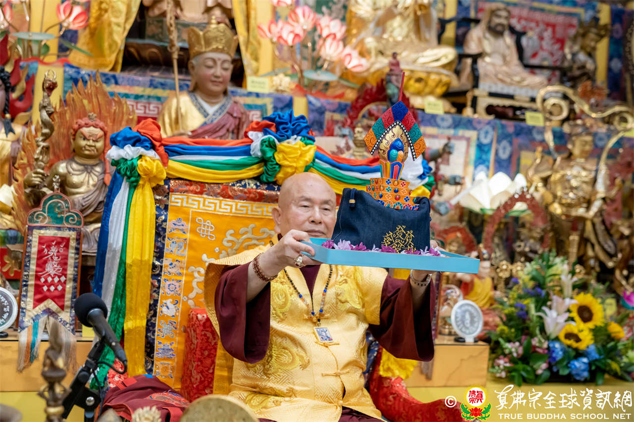 聖尊精闢寶貴的法語開示後,慈悲為新皈依弟子做皈依灌頂,然後加持大悲咒水,開光佛像,最後持拂塵一一加持與會大眾。
