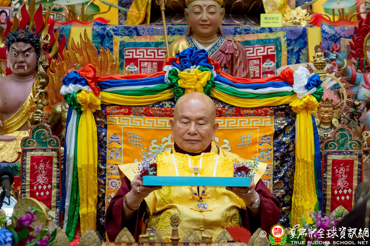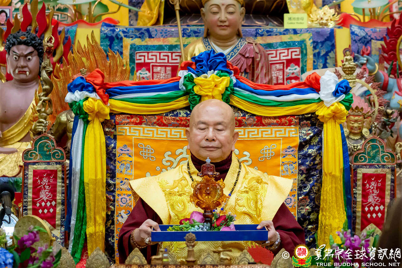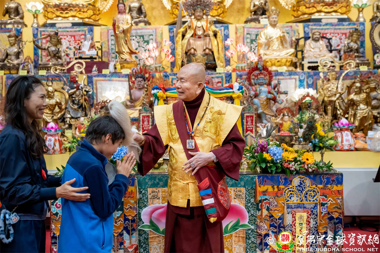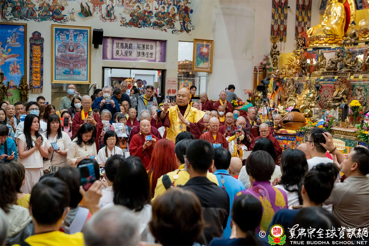 聖尊精闢寶貴的法語開示後,慈悲為新皈依弟子做皈依灌頂,然後加持大悲咒水,開光佛像,最後持拂塵一一加持與會大眾。