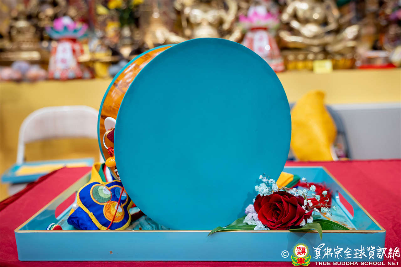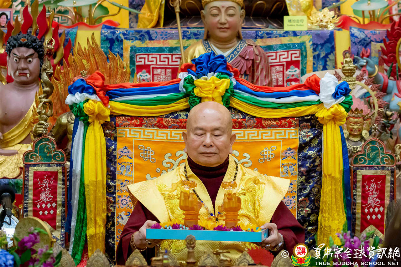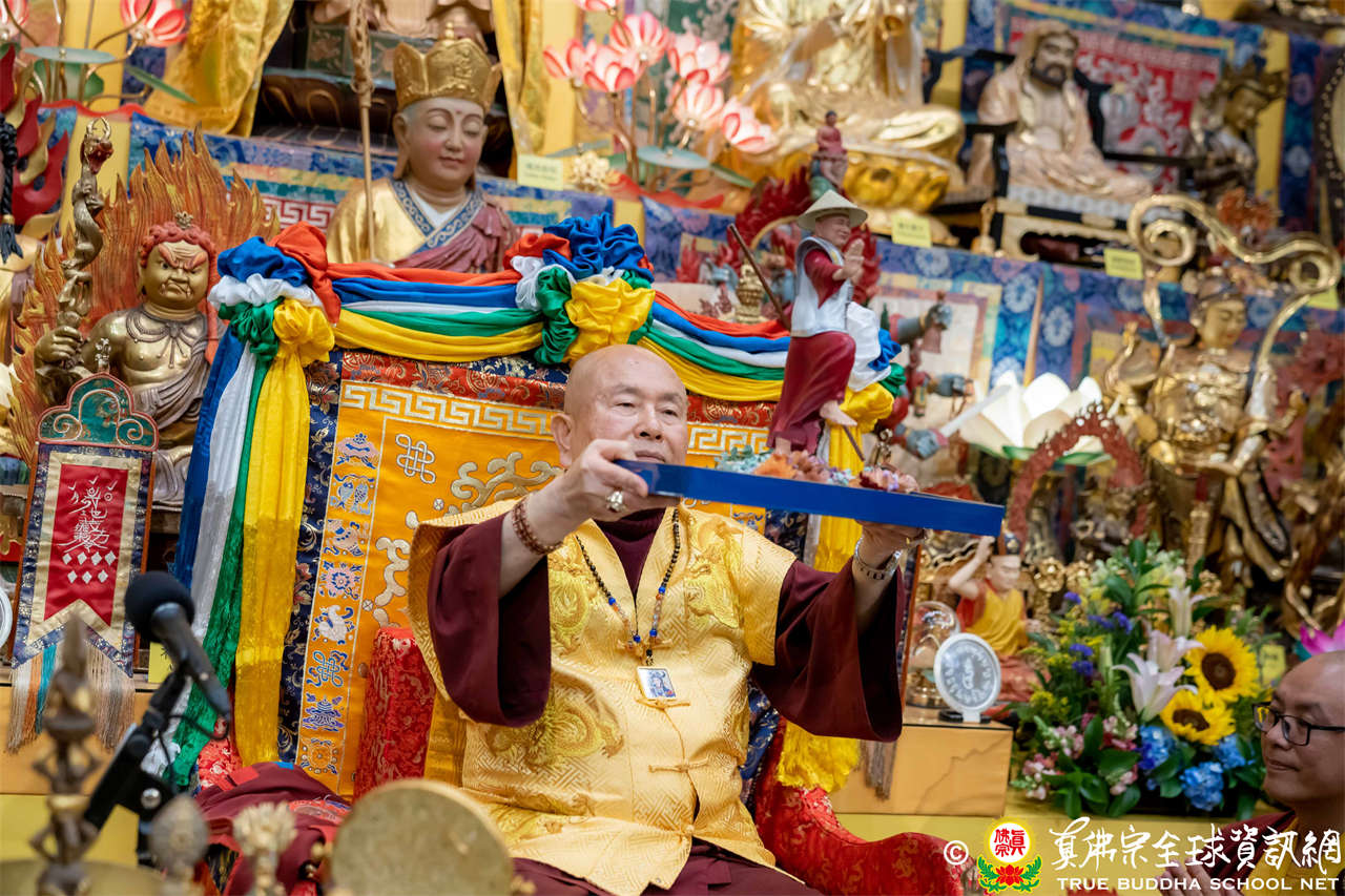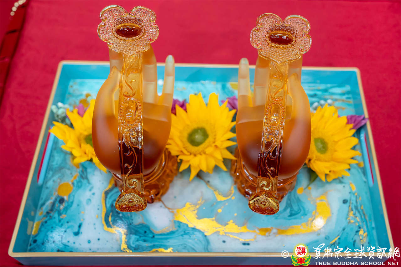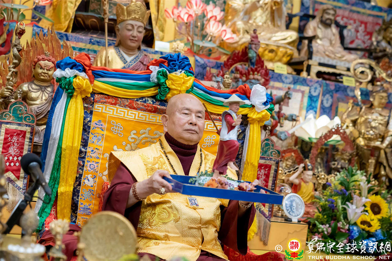 聖尊精闢寶貴的法語開示後,慈悲為新皈依弟子做皈依灌頂,然後加持大悲咒水,開光佛像,最後持拂塵一一加持與會大眾。