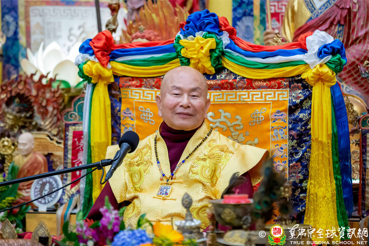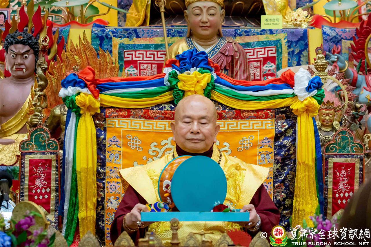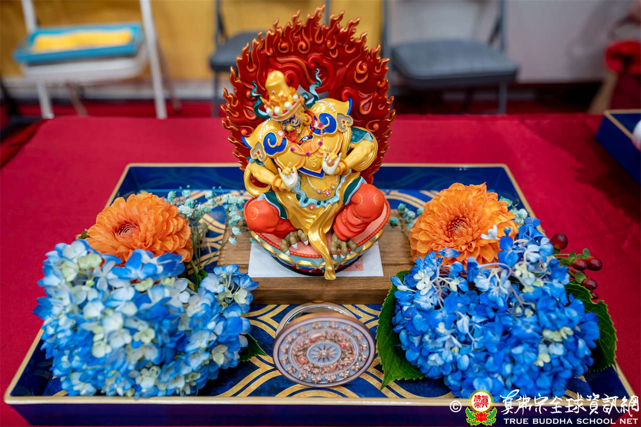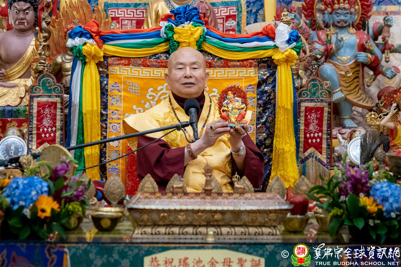 開示時,聖尊捧起扎基拉姆的金身,告訴大眾:這一尊坐姿的扎基拉姆,非常莊嚴,是西雅圖雷藏寺首創、獨有的,跟市面上所有的扎基拉姆不一樣,這尊扎基拉姆的主要顏色是黃色,祂放黃色的光,代表增益,這也是我們這一次法會的重點,要讓大家的資糧與願望得到滿足,讓大家能夠暴富。