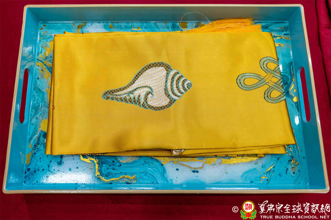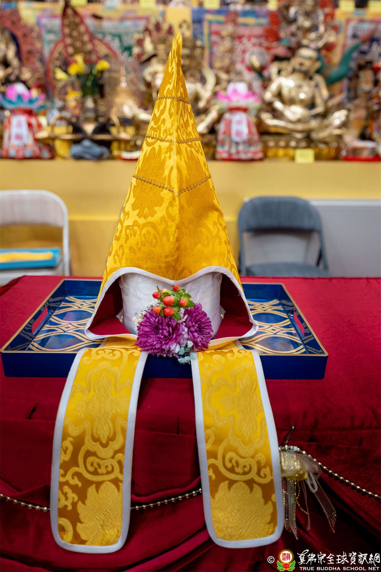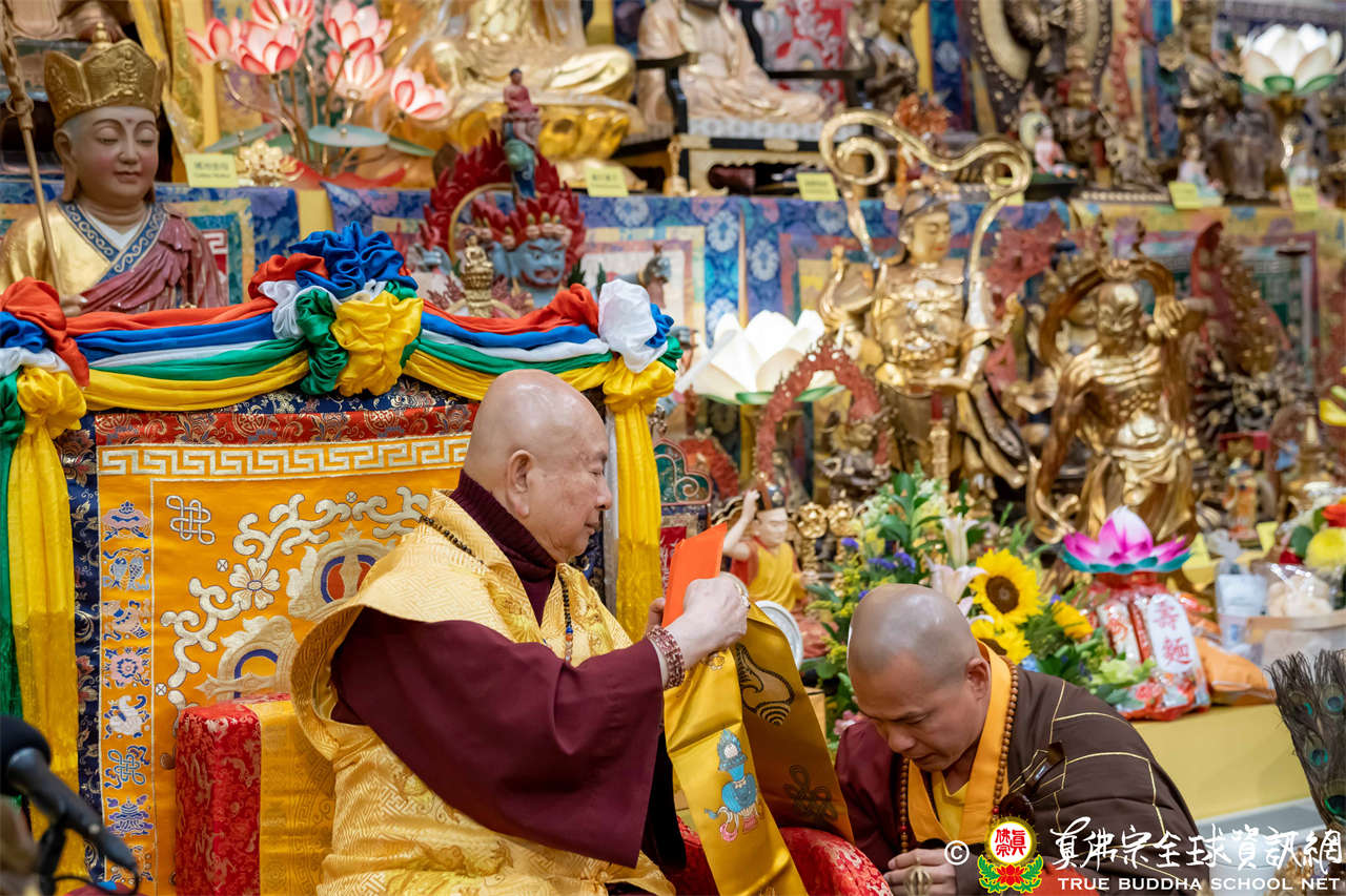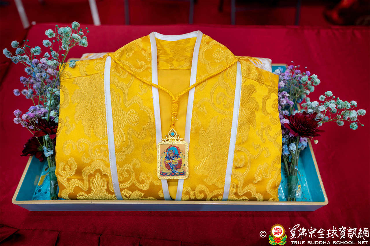 開示時,聖尊捧起扎基拉姆的金身,告訴大眾:這一尊坐姿的扎基拉姆,非常莊嚴,是西雅圖雷藏寺首創、獨有的,跟市面上所有的扎基拉姆不一樣,這尊扎基拉姆的主要顏色是黃色,祂放黃色的光,代表增益,這也是我們這一次法會的重點,要讓大家的資糧與願望得到滿足,讓大家能夠暴富。