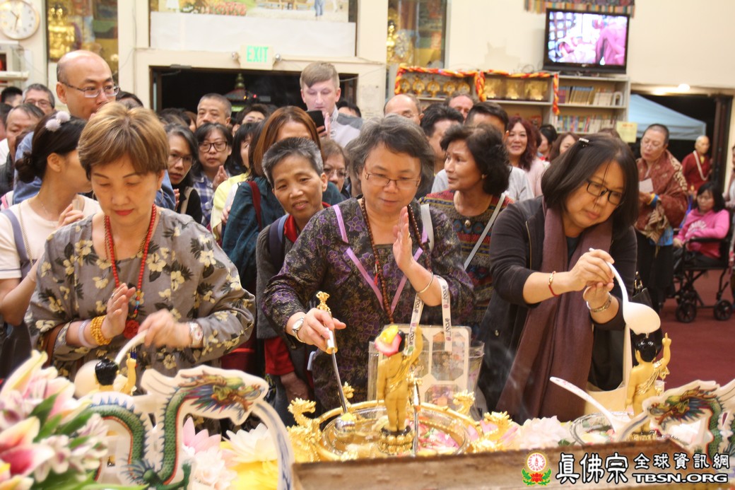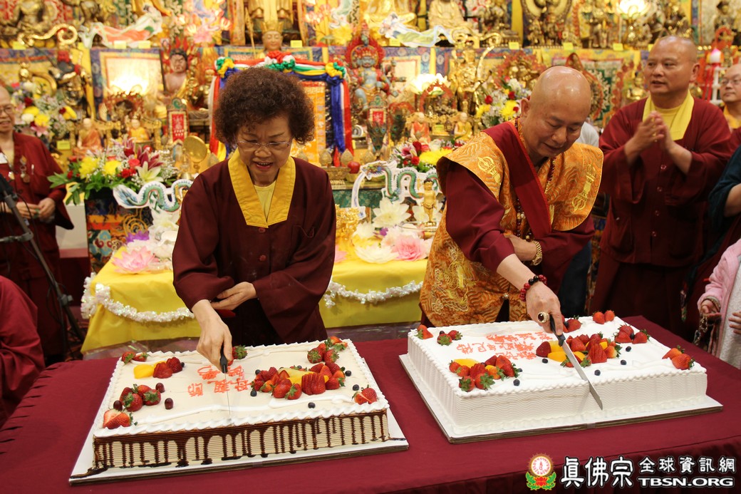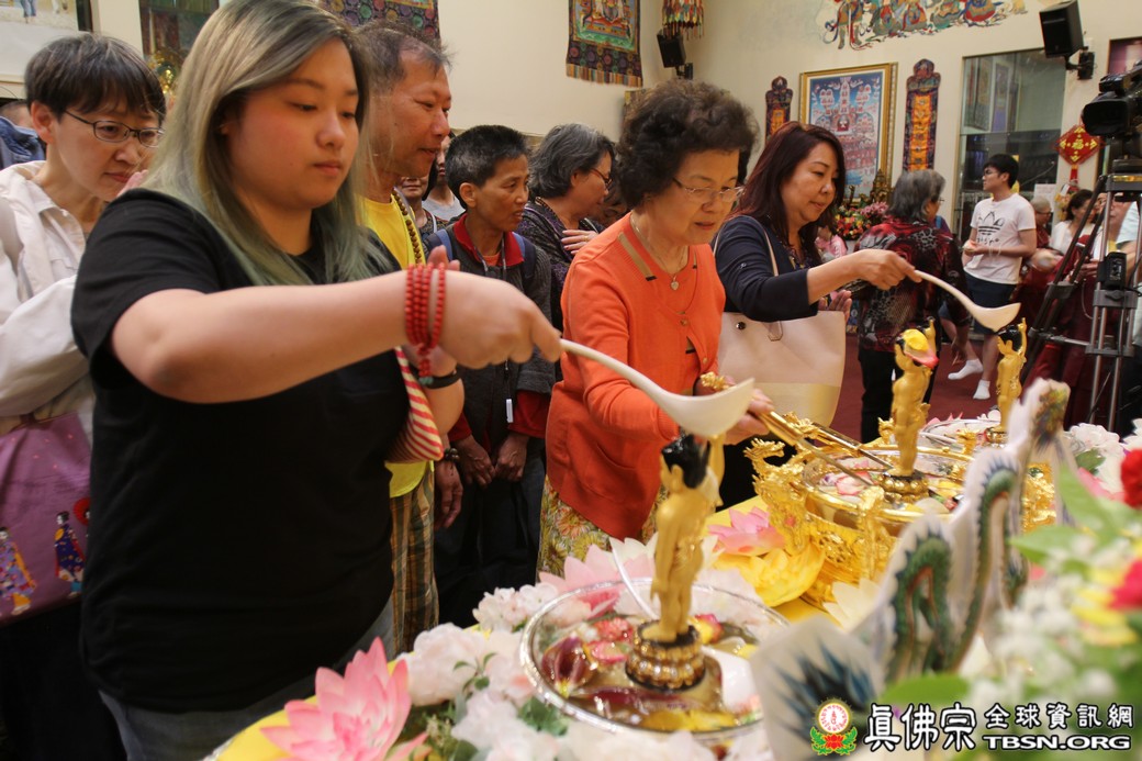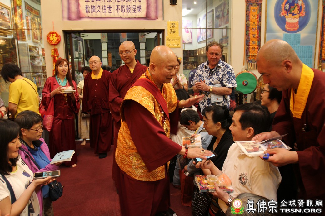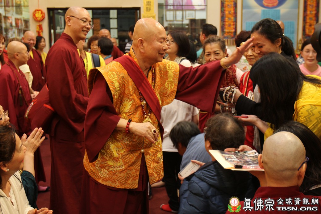 在精闢的開示結束後,聖尊為多位信眾們賜授皈依灌頂,並加持大悲咒水、開光佛像。然後,聖尊與師母一同帶領大眾開始浴佛,藉由浴佛的功德來淨化我們的身口意,去除貪嗔癡。浴佛後,聖尊不辭辛苦,還慈悲為大眾簽書,每個簽書的弟子都將聖尊的新書視如珍寶,幾乎是人手一本,開心得不亦樂乎。簽書會結束後,聖尊、師母還和大家一起切慶祝佛誕及母親節的大蛋糕,大眾齊聲歡唱生日快樂歌。