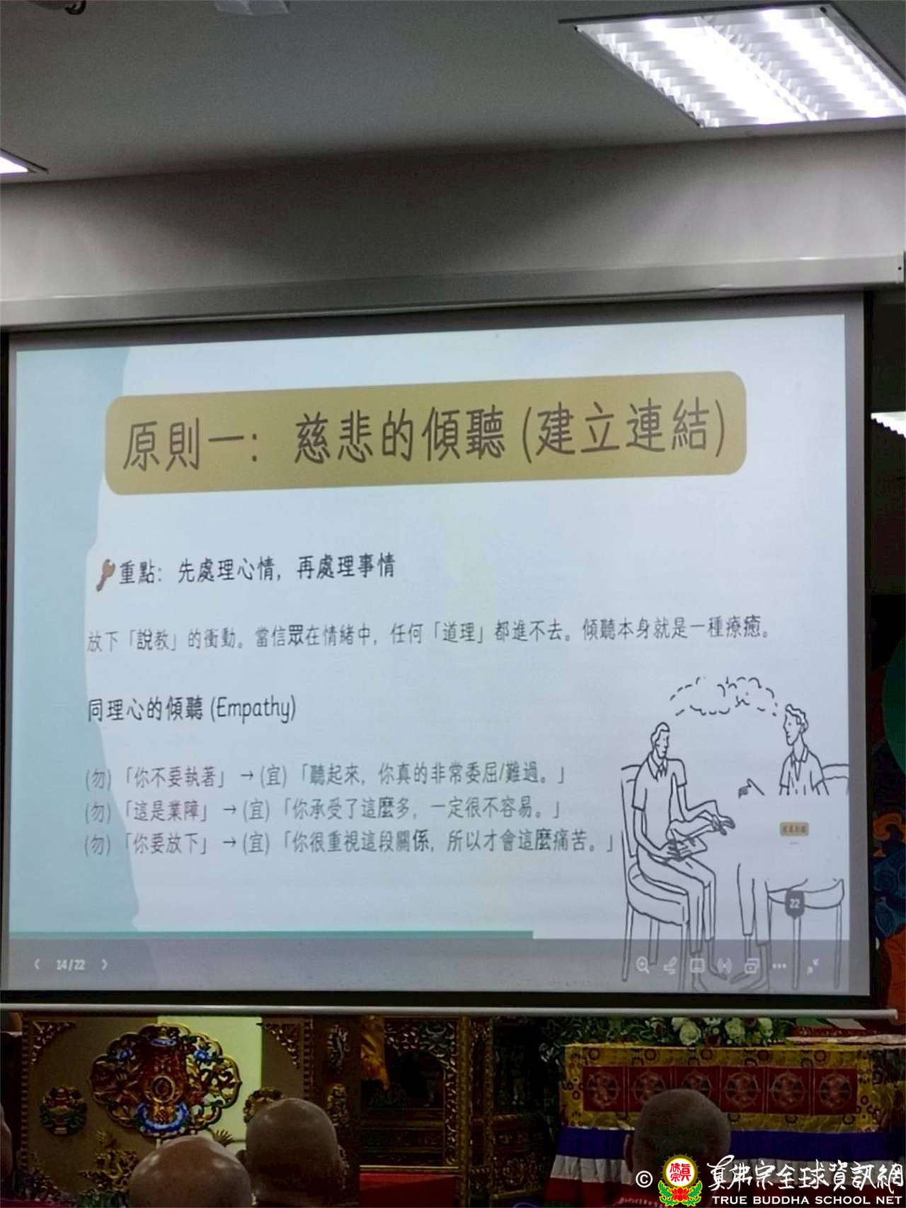 當信眾情緒激動時,切勿急於說教,例如「你要放下」或「這是業障」。這些話只會讓對方關上心門。