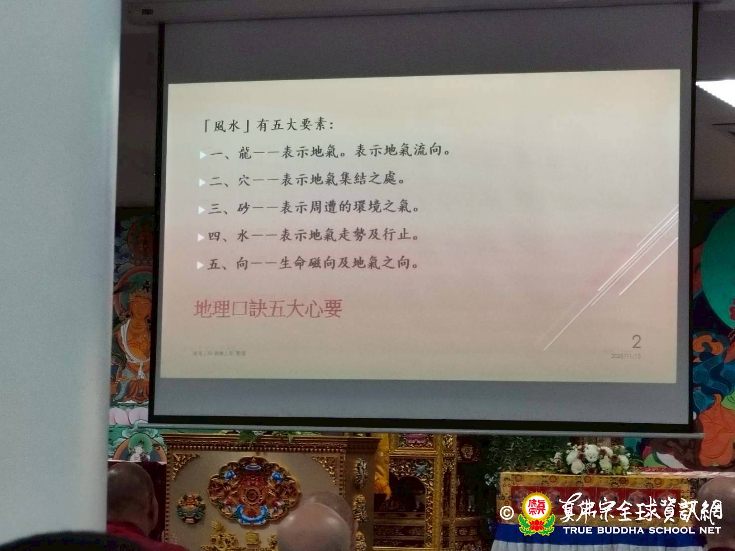 課程後半段,釋蓮滿上師(蓮滿上師)接續講授陽宅風水。上師提醒,風水課程是為了讓大家「醒過來」,回到人間法。