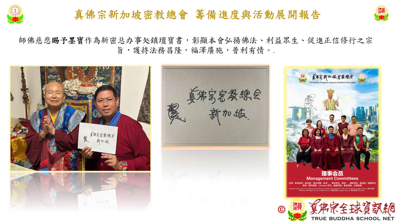 新密總的籌備階段,所有的理事、委員皆由新加坡各道場單位的代表組成,新加坡三位上師則以顧問的角色給予協助,未來理事會改選亦秉持這樣的架構,象徵新加坡團結共榮,主要為凝聚力量推動教育、文化與慈善,以此將真佛密法深入民間。